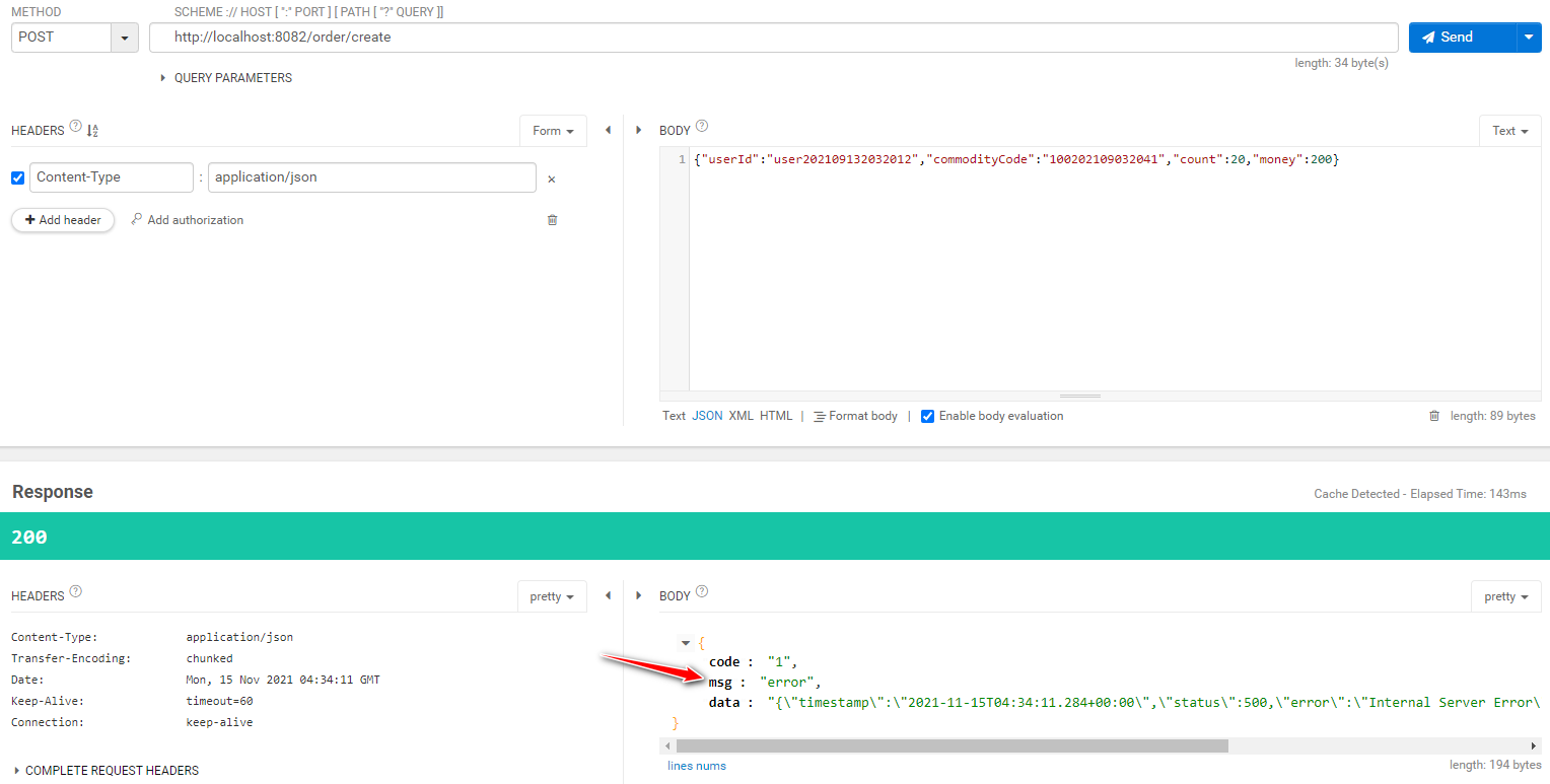 再次调用创建订单的http://localhost:8082/order/create接口,将商品数量设置为20,详细请求体如下所示: