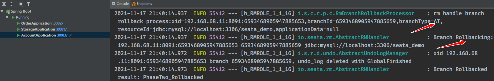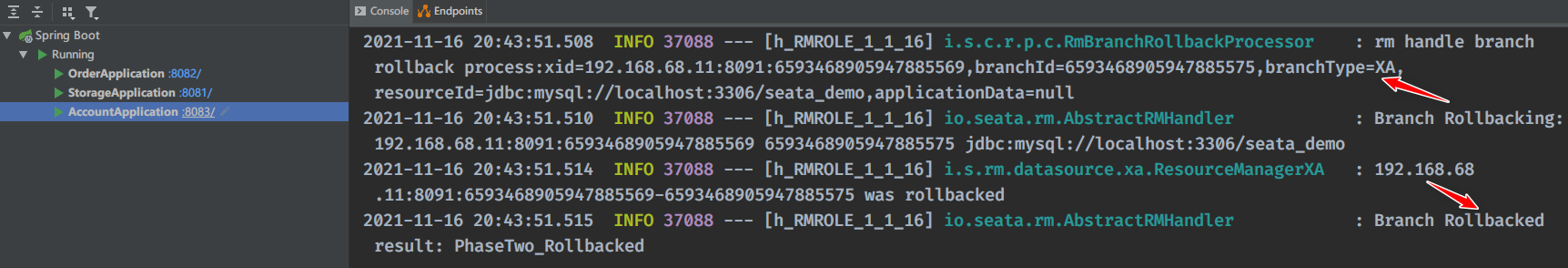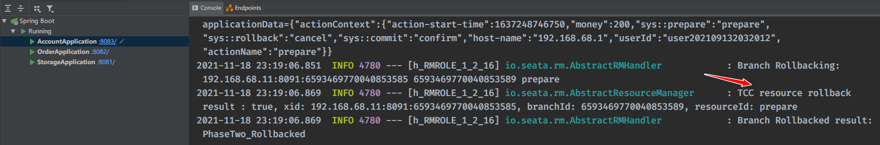 可以发现,当我们多个服务中有一个因为报错而回滚时,其他服务也会回滚。从account-service服务的控制台日志也可以看出确实已经进行了回滚操作: