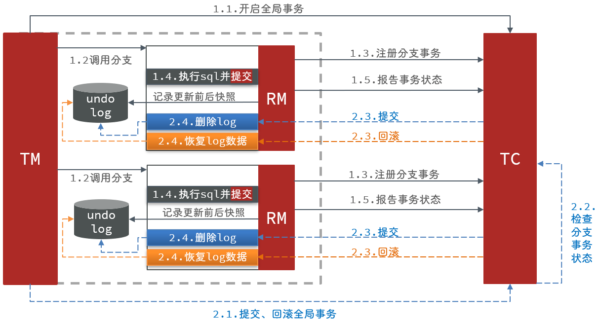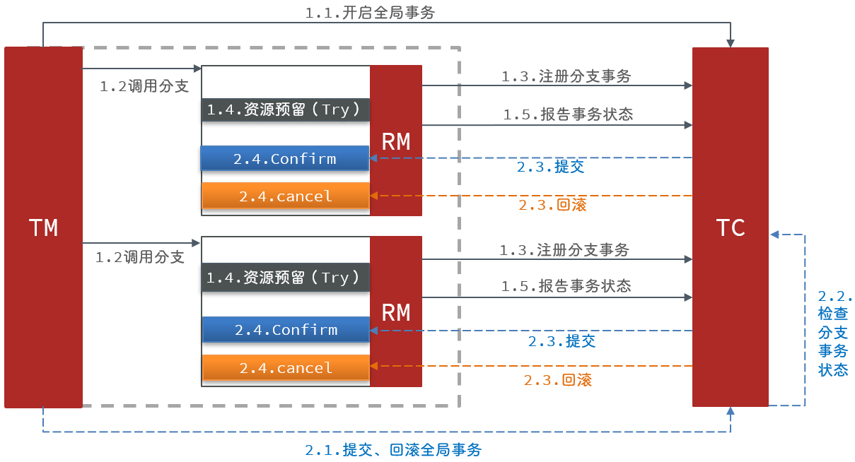「Transaction Coordinator (TC)」 :事务协调器,维护全局事务的运行状态,负责协调并驱动全局事务的提交或回滚。「Transaction Manager (TM)」 :控制全局事务的边界,负责开启一个全局事务,并最终发起全局提交或全局回滚的决议。「Resource Manager (RM)」:控制分支事务,负责分支注册、状态汇报,并接收事务协调器的指令,驱动分支(本地)事务的提交和回滚。
