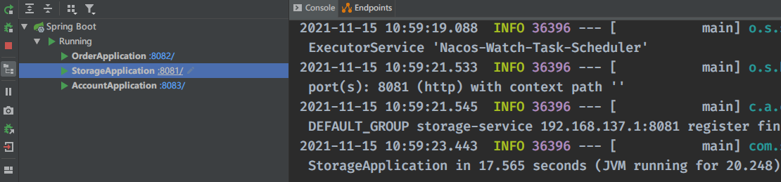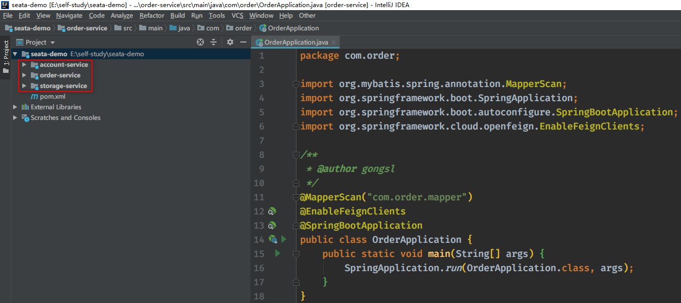 项目工程是seata-demo,主要包含以下三个服务,分别是order-service(订单服务)、account-service(账户服务)以及storage-service(库存服务):