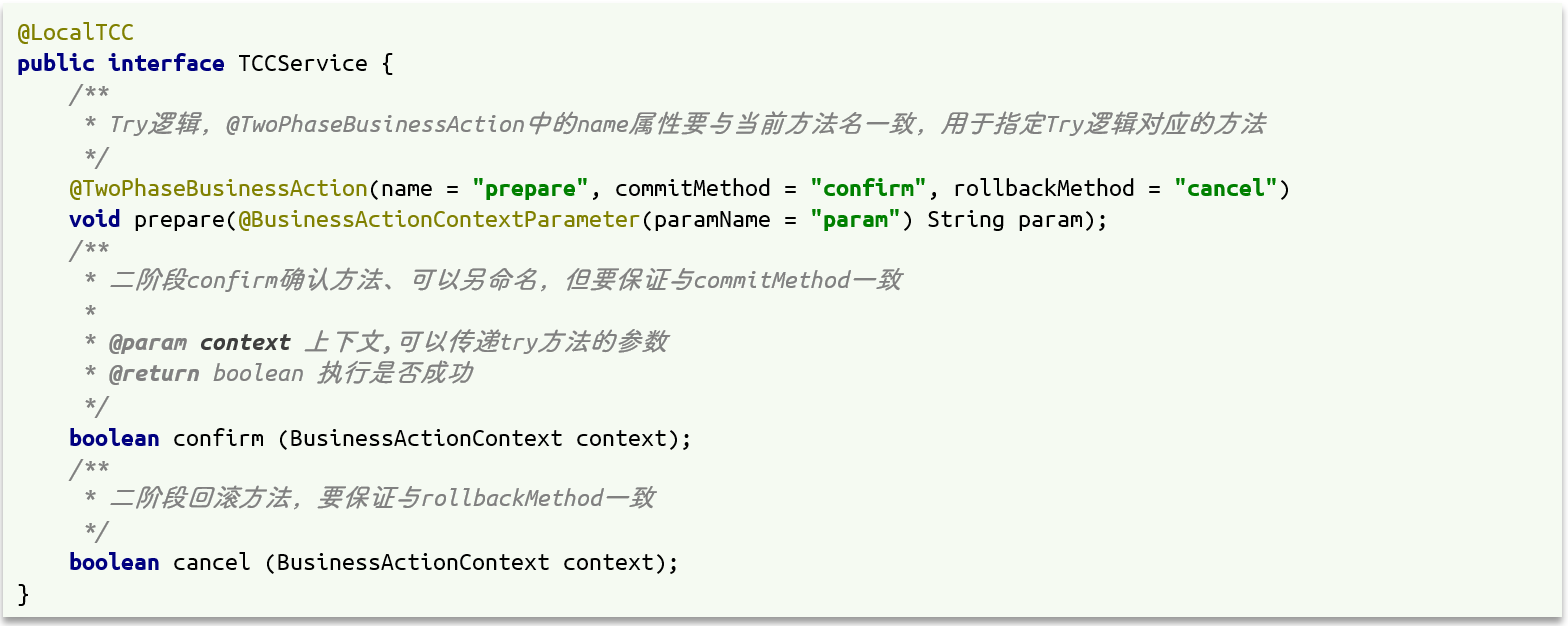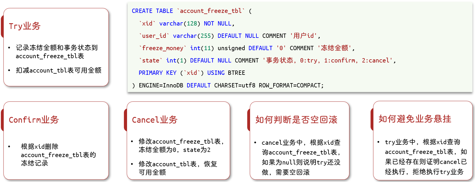 - 二阶段:成功则什么都不做,失败则通过编写补偿业务来回滚。