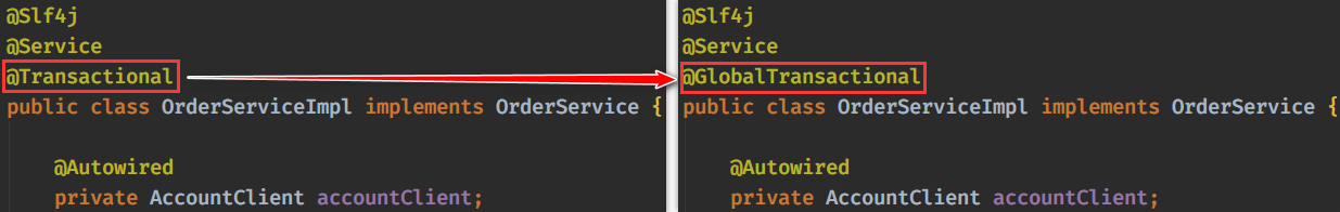 3、给发起全局事务的入口类或方法添加@GlobalTransactional注解: