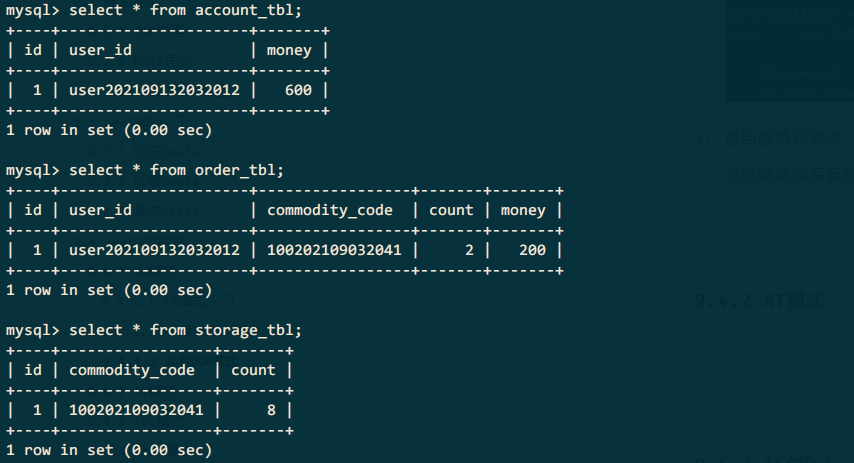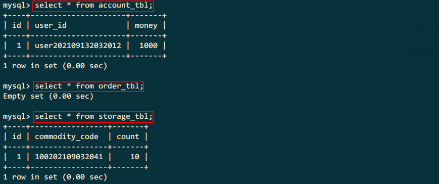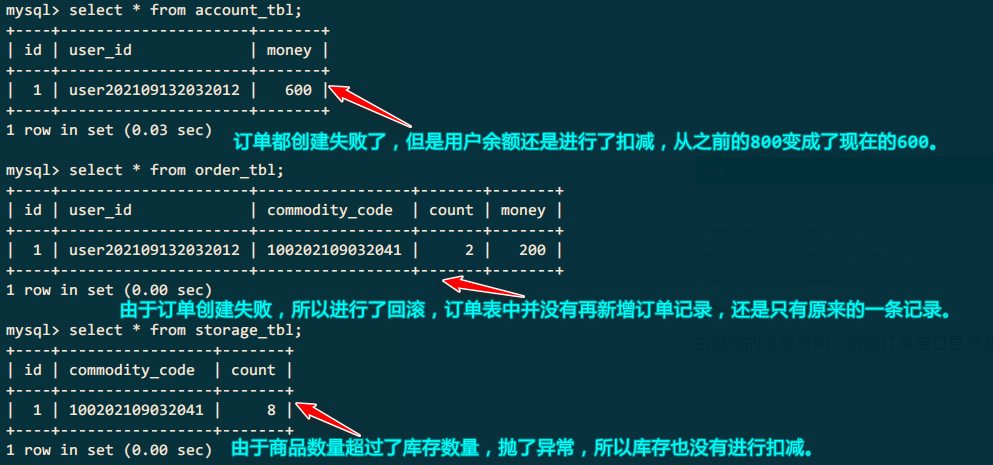 由返回的应答可知,创建订单接口显然已经调用异常了,这时候我们再看看数据库中各个表的数据情况: