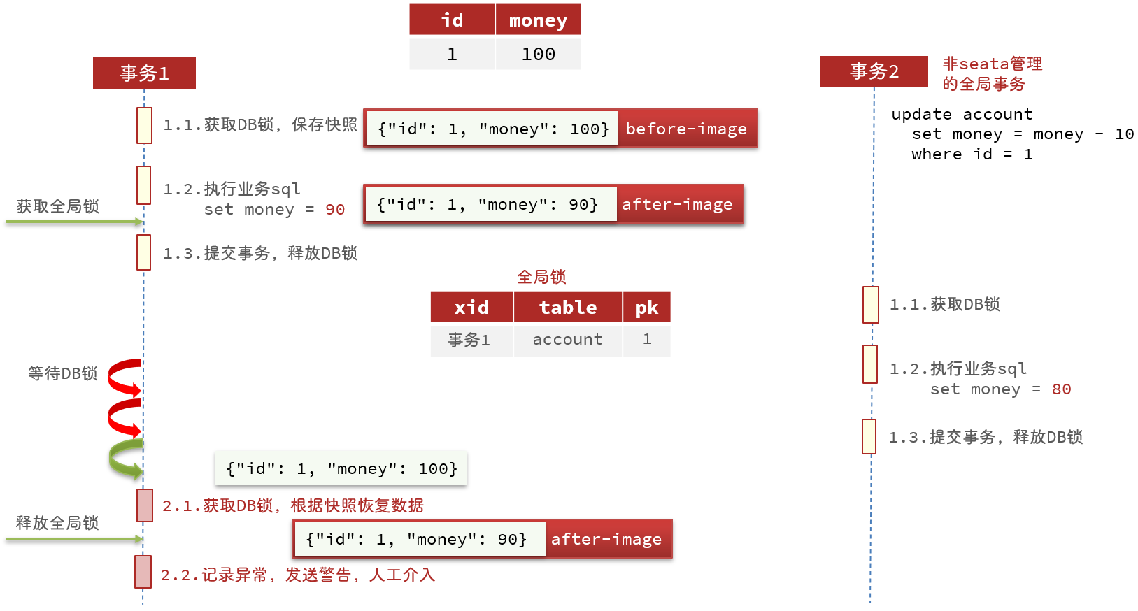 解释说明:其实Seata在保存快照的时候,是会保存两份的,即不仅会把更新前的数据保存为快照,还会把更新后的数据保存为快照。所以在事务一获取到全局锁后进行数据库操作时,如果还有一个非Seata管理的事务也对同样的数据进行了操作的话,一旦事务一操作有问题要回滚,Seata就会比对之前执行业务sql后的快照,看看数据库中的数据是不是和快照的一致,一致就回滚,不一致就说明自己在操作期间还有别的事务对数据库中相同的数据进行了操作,那就发出警告通知人工介入来进行解决。