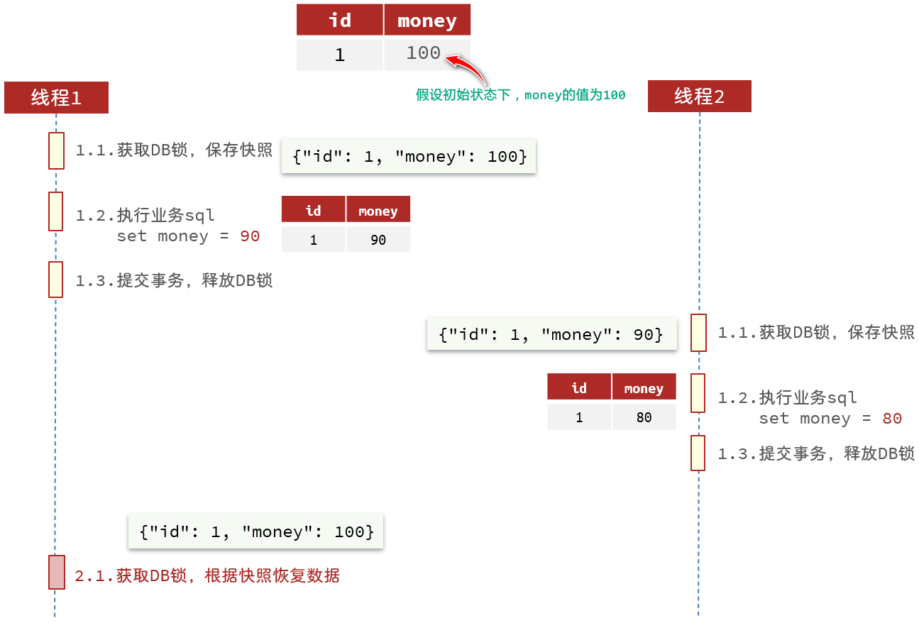 解释说明:如上图所示,线程一在第一阶段首先会记录快照,即money等于100,执行完业务sql并提交后,money的值就变成了90。提交后就会释放数据库锁,假设此时线程二过来抢到了锁,由于此时money的值是90,所以就将此时的值作为线程二的快照进行了保存,然后就开始执行业务sql并提交,执行完之后money的值就变成了80。线程二提交后会释放数据库锁,假设线程一又抢到了锁,然后就开始进行第二阶段的操作,可是如果第二阶段出错了,就会根据之前记录的快照进行回滚,然后money的值就会变成100了。但是数据库中money的值已经被线程二改过一次了,线程一失败后还是将money的值回滚成100显然是有问题的。