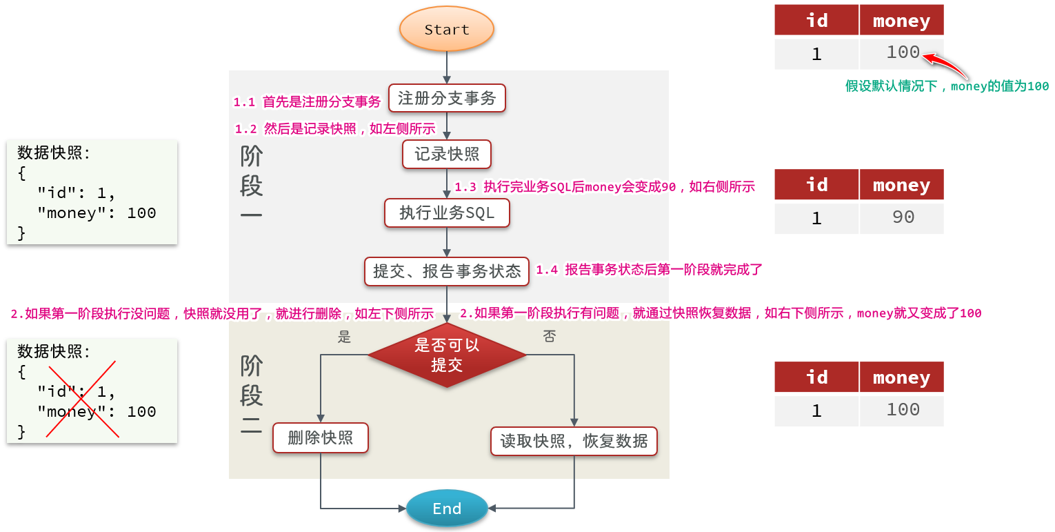 举个例子,比如一个分支业务的SQL是这样的:update tb_account set money = money - 10 where id = 1,那么两个阶段的执行逻辑就如下所示: