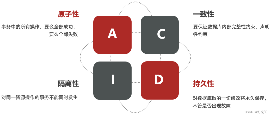 事务必须具有的四个特性分别是:原子性(atomicity)、一致性(consistency)、隔离性(isolation,又称独立性)以及持久性(durability)。这就是事务的ACID原则。