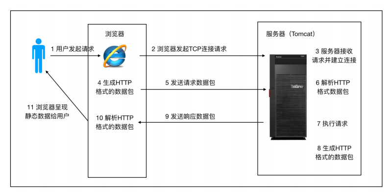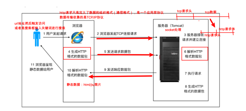 注意:浏览器访问服务器使用的是Http协议,Http是应用层协议,用于定义数据通信的格式,具有的数据传输使用的是TCP/IP协议。