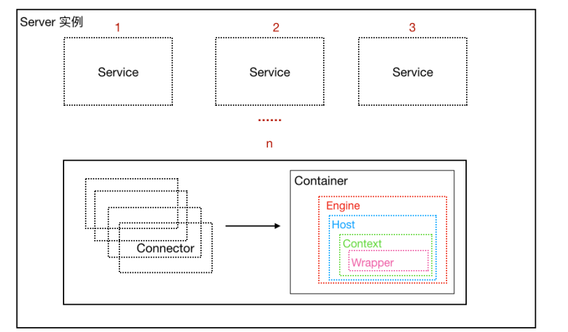 其实,可以认为整个Tomcat就是一个Catalina实例,Tomcat启动的时候会初始化这个实例,Catalina实例通过加载server.xml完成其他实例的创建,创建并管理一个Server,Server创建并管理多个服务,每个服务又可以有多个Connector和一个Container。