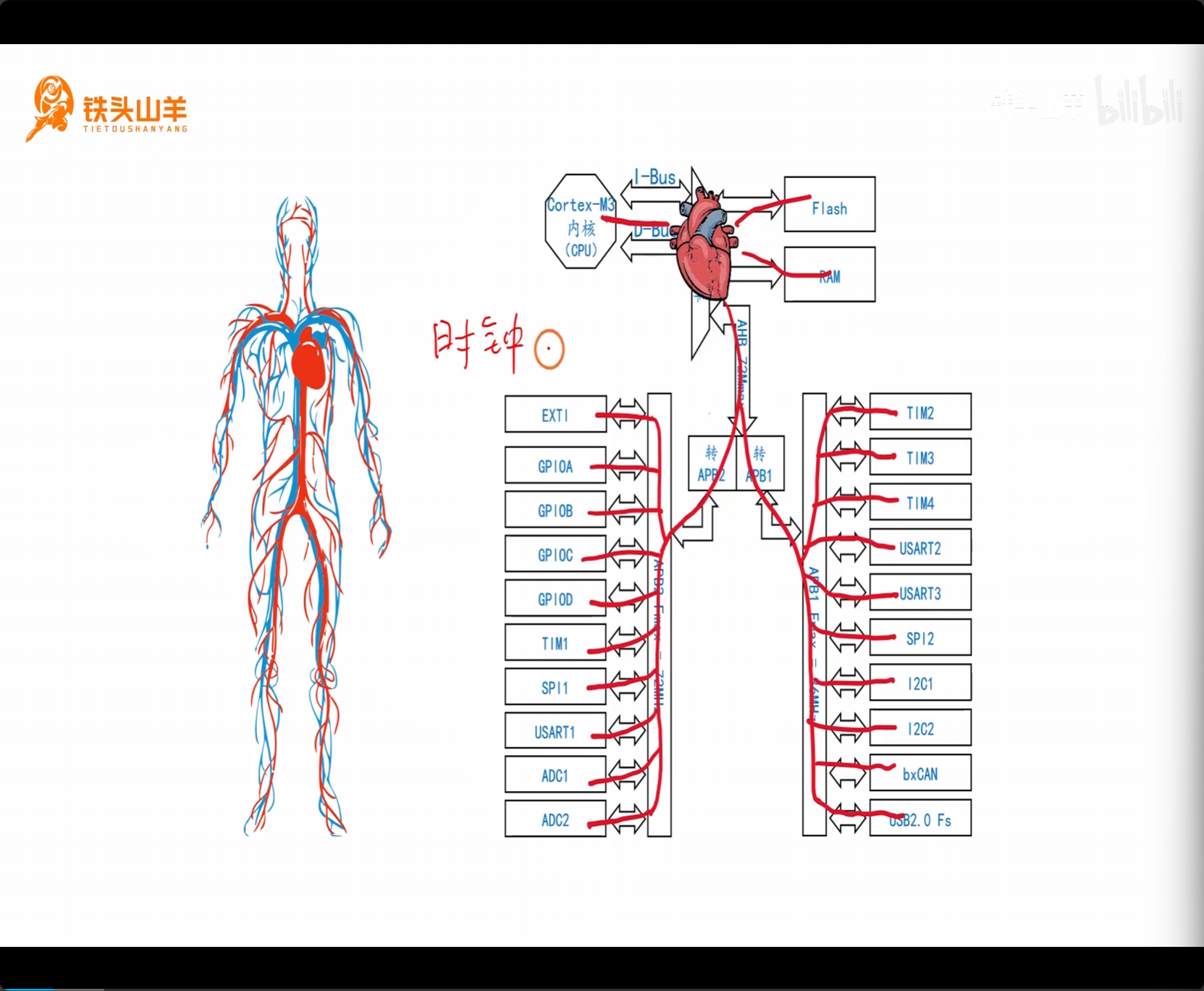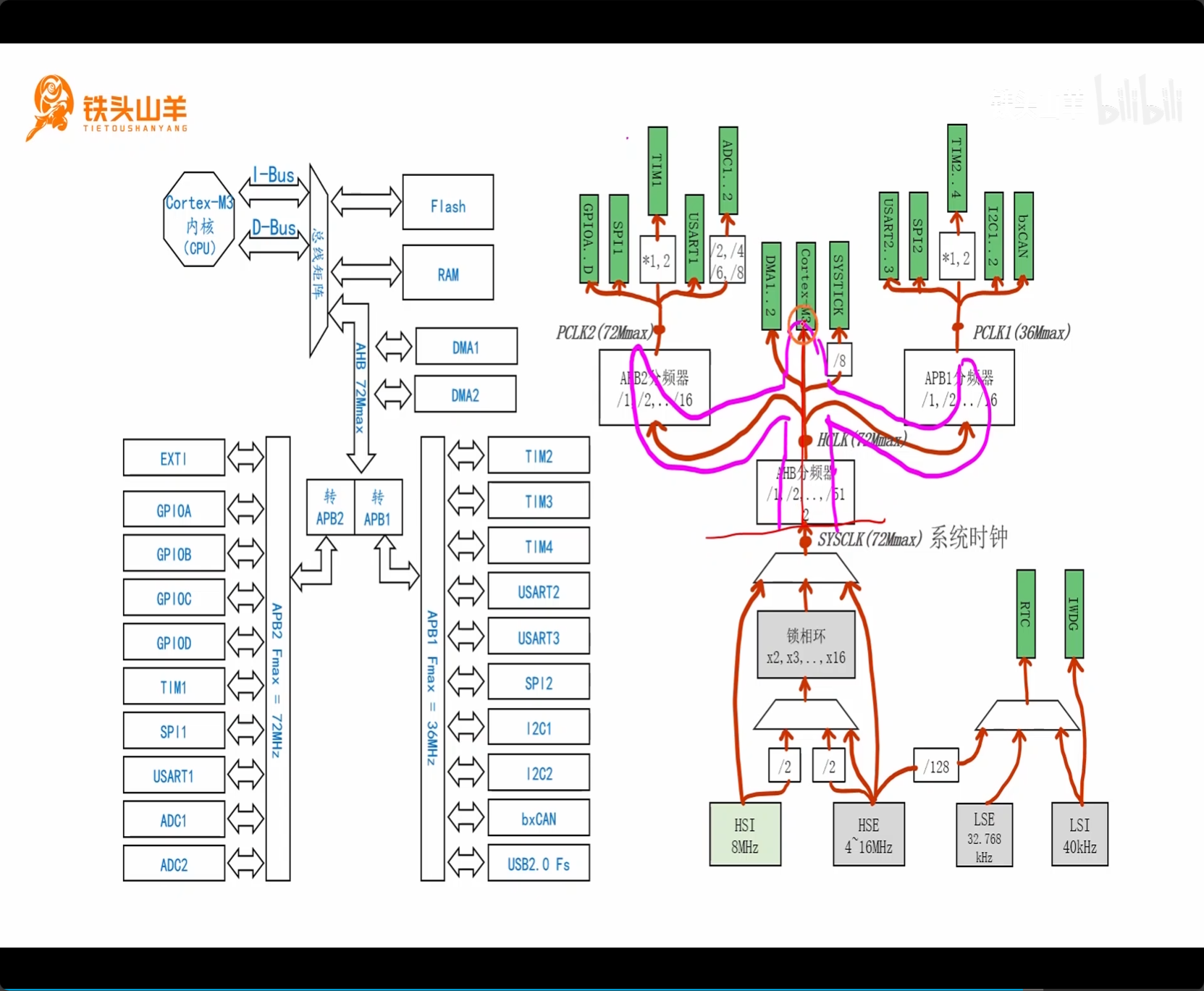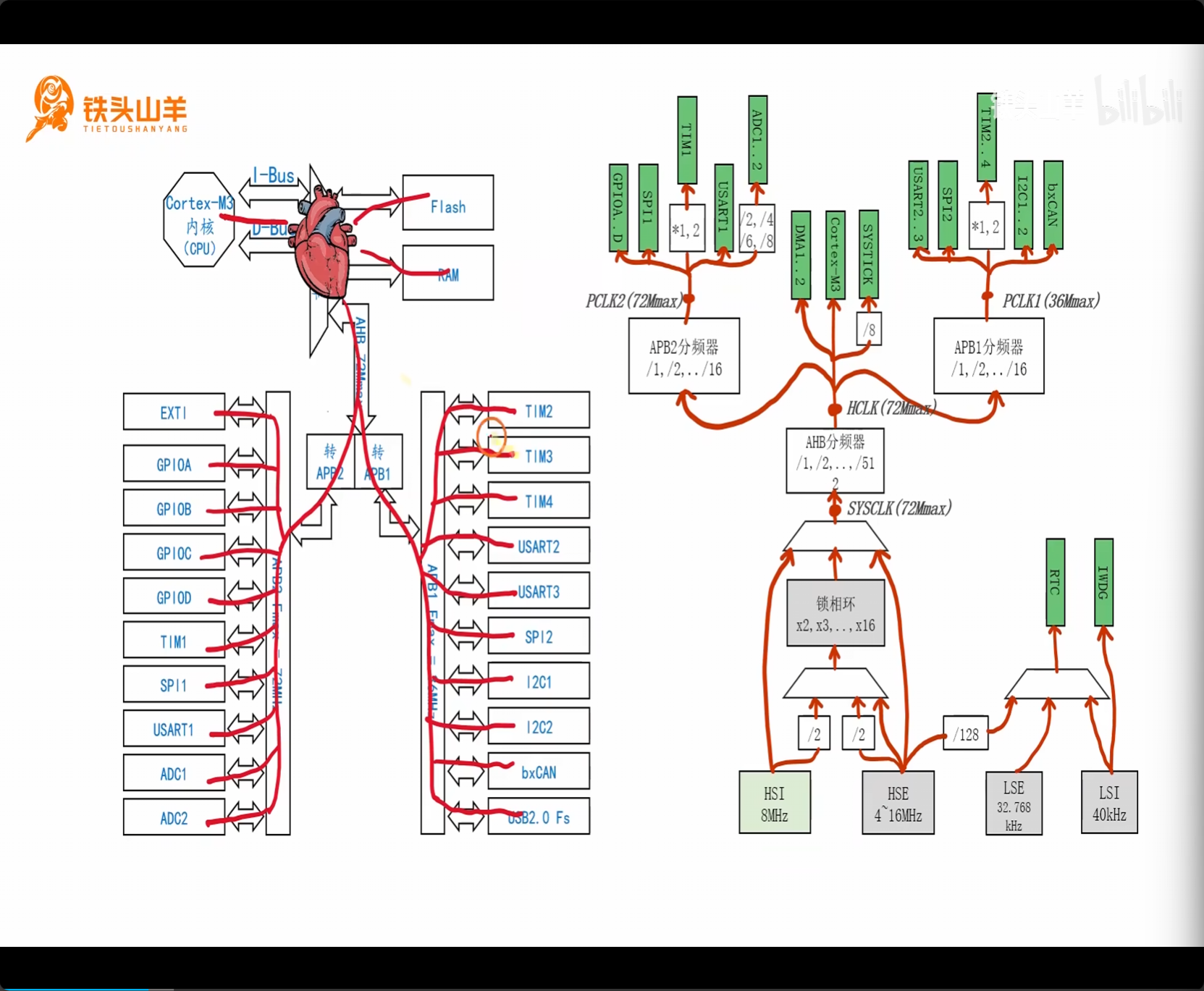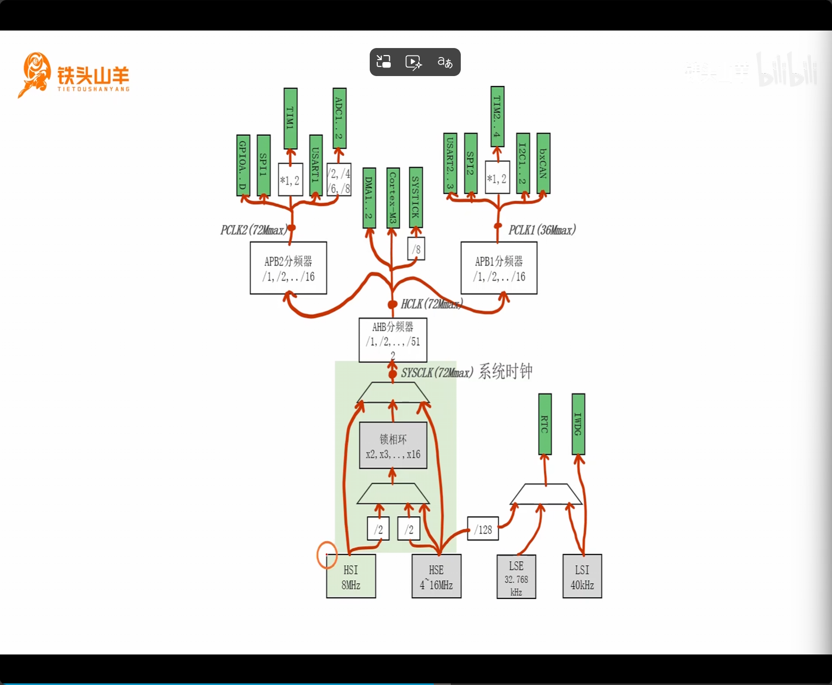 上图为单片机内部时钟,树枝为三根总线(AHB、APB1、APB2 )。