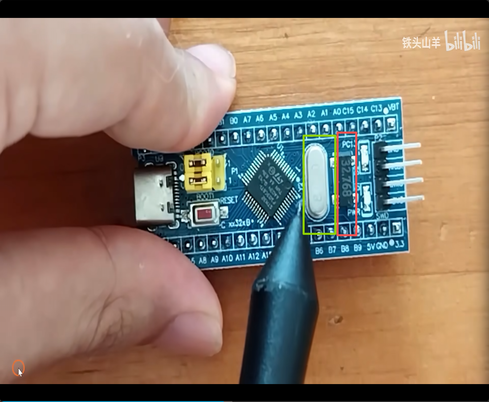 上图为最小系统板上的外部高速晶振(8MHZ)和外部低速晶振(32.768KHZ)