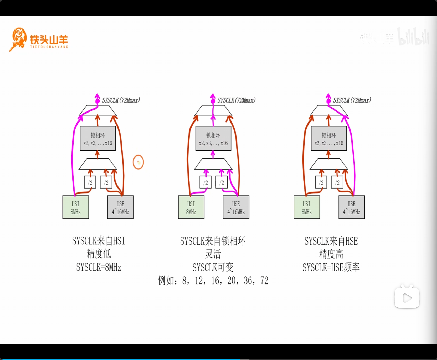 上图为 SYSCLK 来源(HSI、锁相环、HSE)的区别。