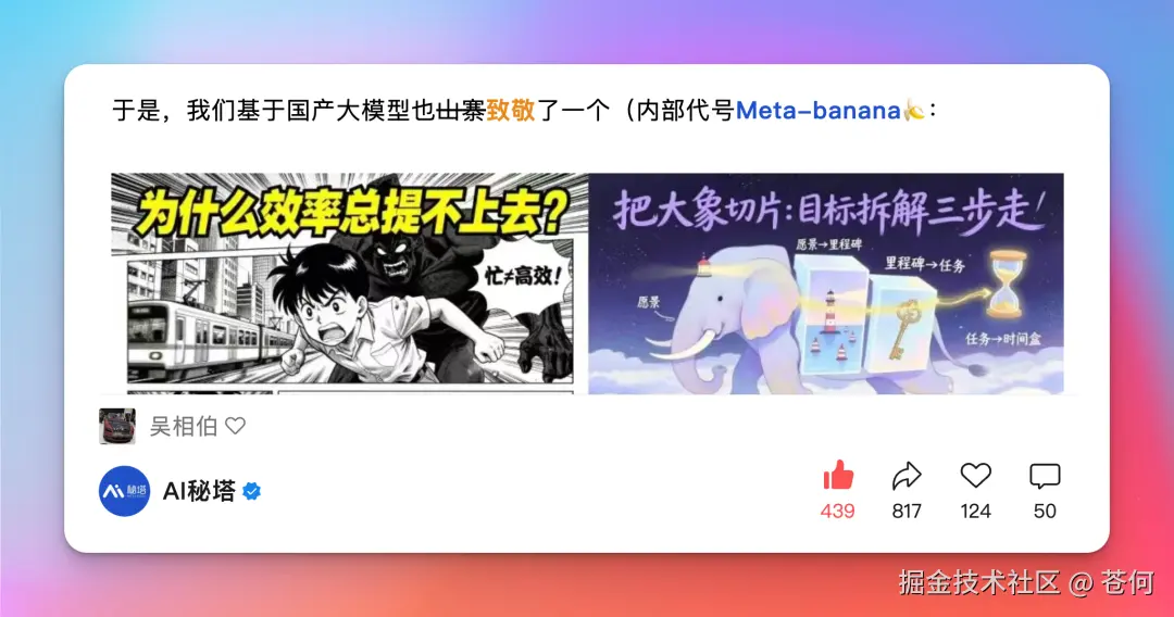 但仔细了解了下他们官方介绍,根本不是接的香蕉 pro,而是基于国产大模型山寨致敬了一个(内部代号Meta-banana🍌