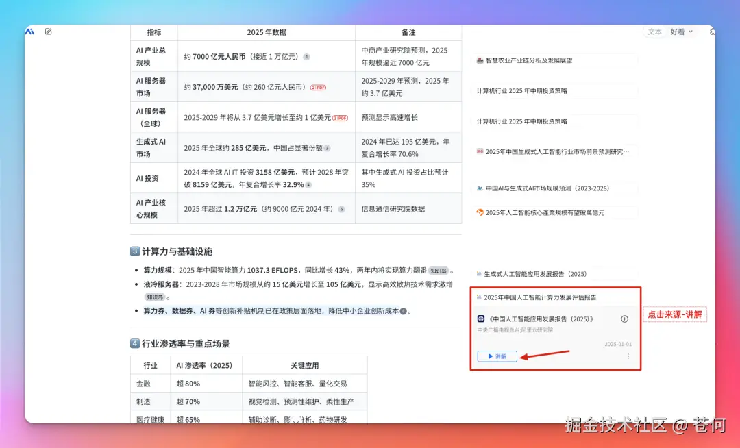 在搜索结果中点击来源,展开后点击「讲解」,同样也能直接生成图片风格的PPT。比如这个《中国人工智能应用发展报告》是搜索结果来源,同样可以让塔老师来生成带图片风格PPT的讲解。