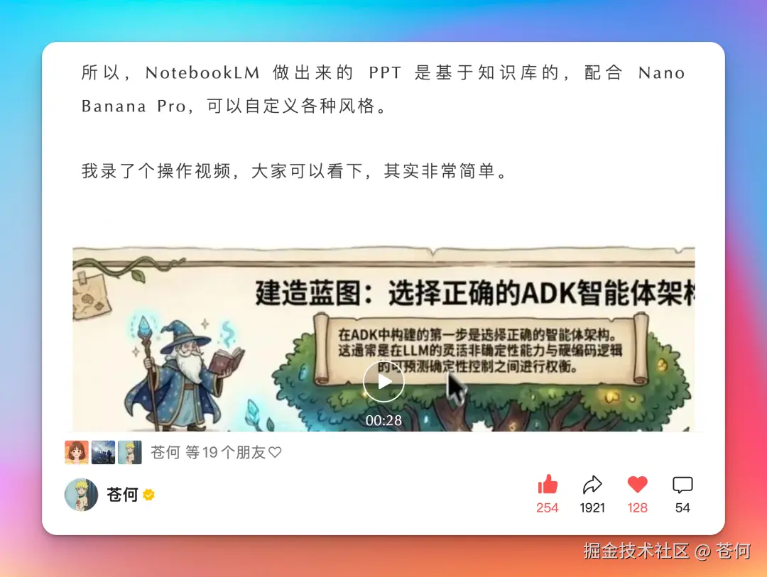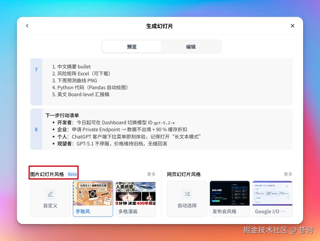 机灵的我一下子就发现了,这不就是最近爆火的香蕉做 PPT 吗?还记得苍何之前分享过的做 PPT 工具,第一个,NotebookLM 吗?