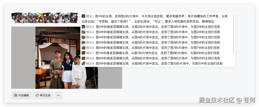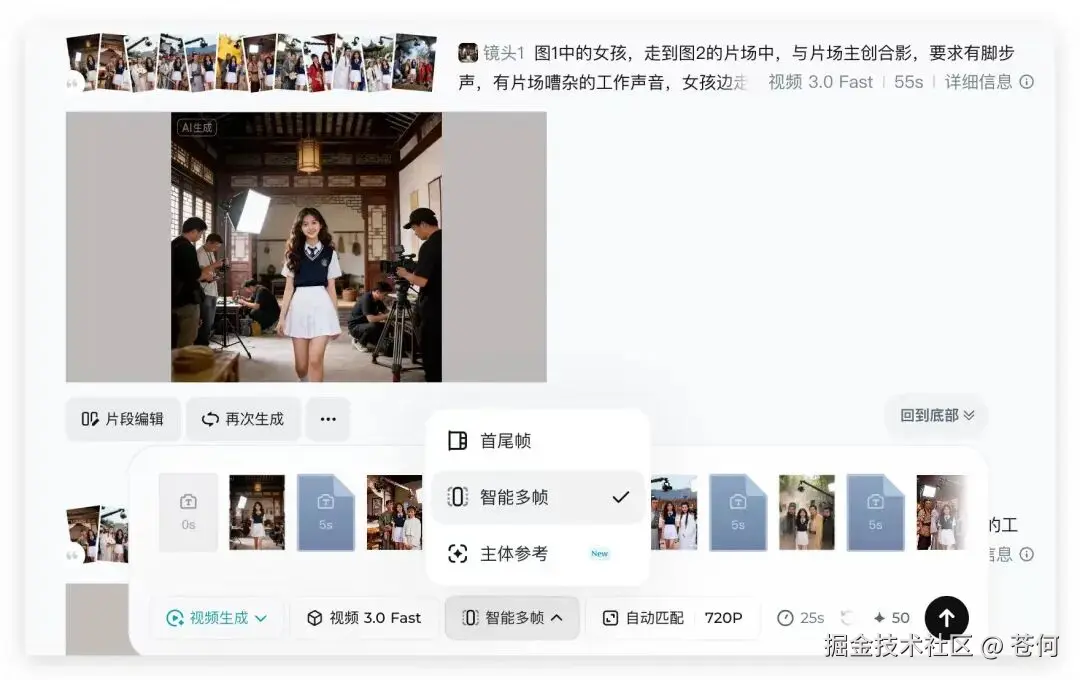 点击「视频生成」,选择「智能多帧模式」,依次导入第二步生成的合影,即梦的智能多帧模式,在帧与帧之间输入提示词,生成好之后,如果对其中某个片段不满意,可以点击左下角的片段编辑。
