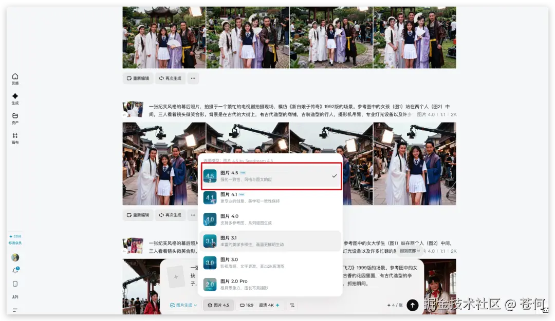 测下来即梦图片 4.5 相较于 4.0 有整体提升,在人像场景和美观度上,4.5得到显著改善,同时在画面美感和推理能力也有所增强。
