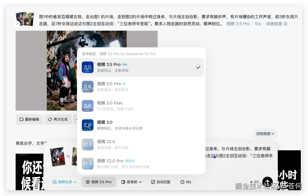 这个视频3.5 Pro 模型是基于字节自研模型Seedance 1.5 Pro,支持视频与音频的同时生成,我的视频中主角说话的声音其实就是通过它依次生成的。