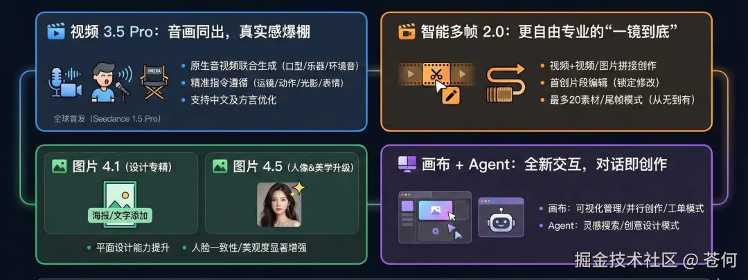 其实这种视频的制作并不复杂,最近尤其可以很简单------就在昨天,即梦网页版做了全新升级,包括画布和 Agent 带来的交互方式更新,视频 3.5 Pro与图片 4.5 等重要模型能力上新,以及能够打造更自由更专业的"一镜到底"的智能多帧2.0。