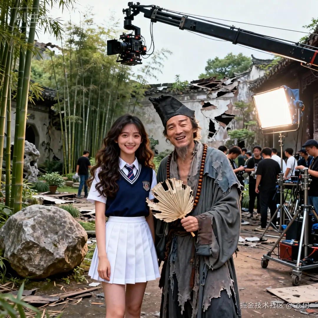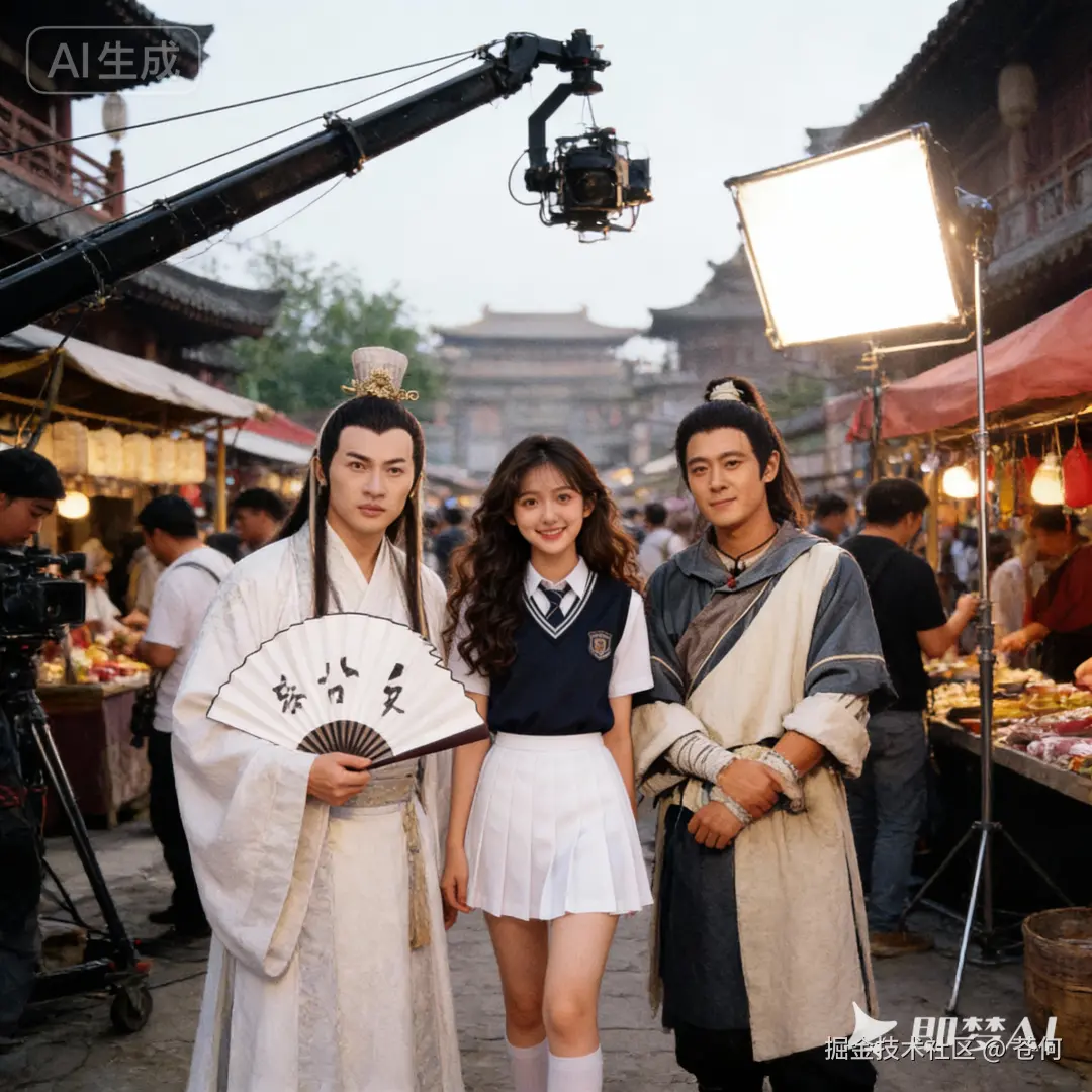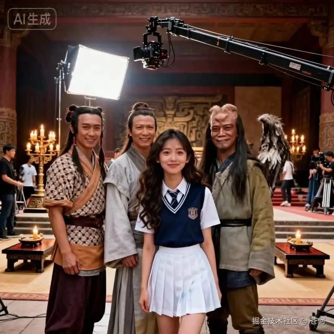 2、参考生成剧照场景图:上传第一步的美女图片及各经典电视剧剧照图片,生成合影;
