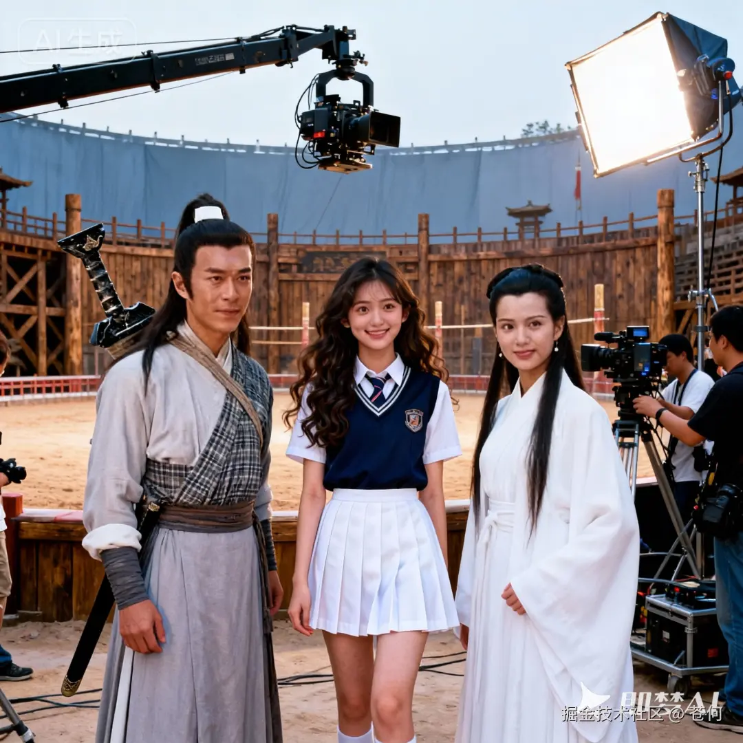 提示词:图2中的卷发百褶裙女孩,从图2的片场中走出,走到了图3的片场中,与图3中的主创们合影