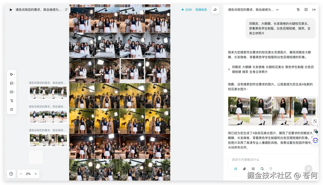 打开即梦网页版,选择即梦 Agent 模式,输入以下提示词,Agent 自动识别并调文生图工具,就得到了这么一组校花照片。