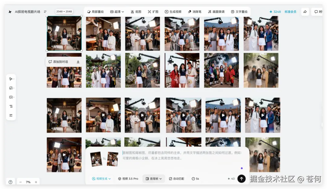 先说工具,这次用的是即梦网页版的画布,在画布里可以调用图片 4.5 和 Agent 模式来生成所需图片,用视频 3.5 pro 来生成同框片场视频,用智能多帧 2.0 来一镜到底出片。总的来说就是最新模型、各种工具都能在画布里随时调用,不用再频繁切换场景,