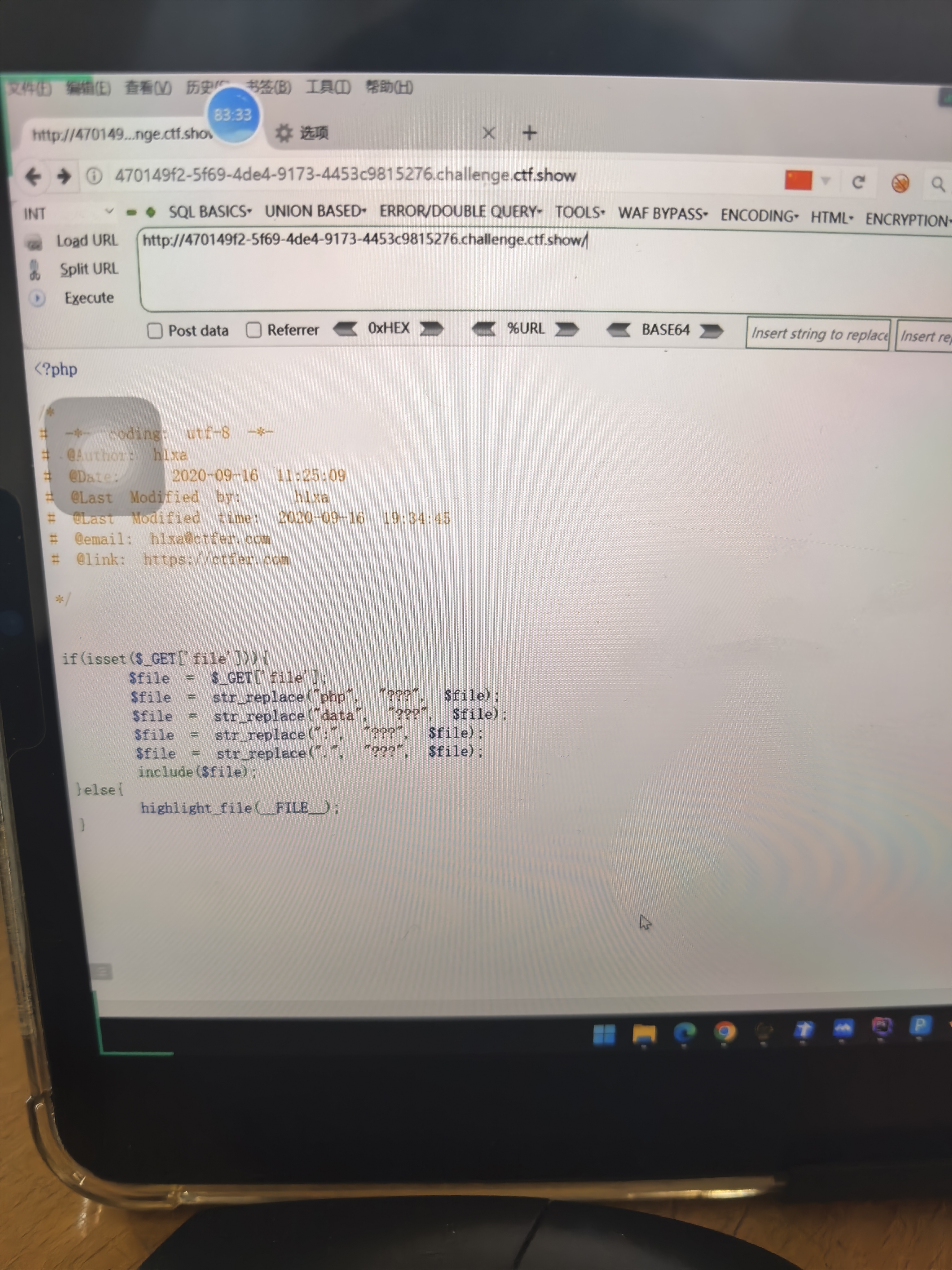 简单说, fpassthru(fp) 是直接把源码打印出来的代码,而 header("Content-Type: image/jpeg") 让源码不会被PHP解析、只能以文本输出, fopen(name, 'rb') 则打开了要输出的源码文件,这三句是导致源码回显的核心代码。