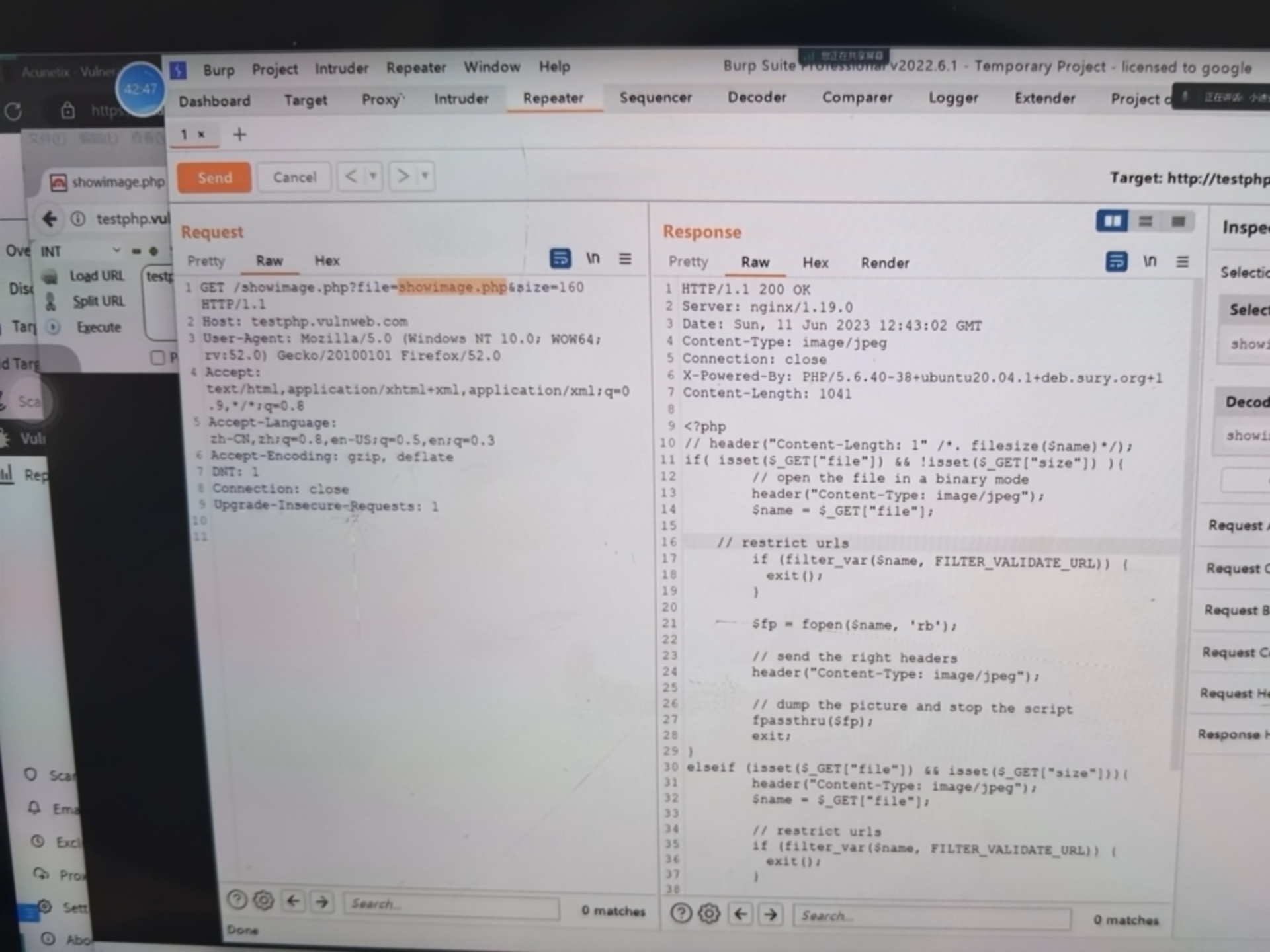 fpassthru($fp) :这是源码回显的直接动作------这个函数会把 fopen 打开的文件(这里是 showimage.php )的所有内容原封不动地输出到响应里,Burp捕获到这些内容,就是你看到的源码回显。