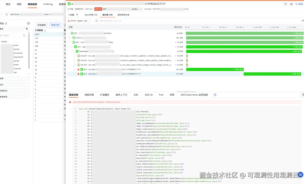 - 查看链路的瀑布图,有 1 分钟超时报错,建议检查超时设置