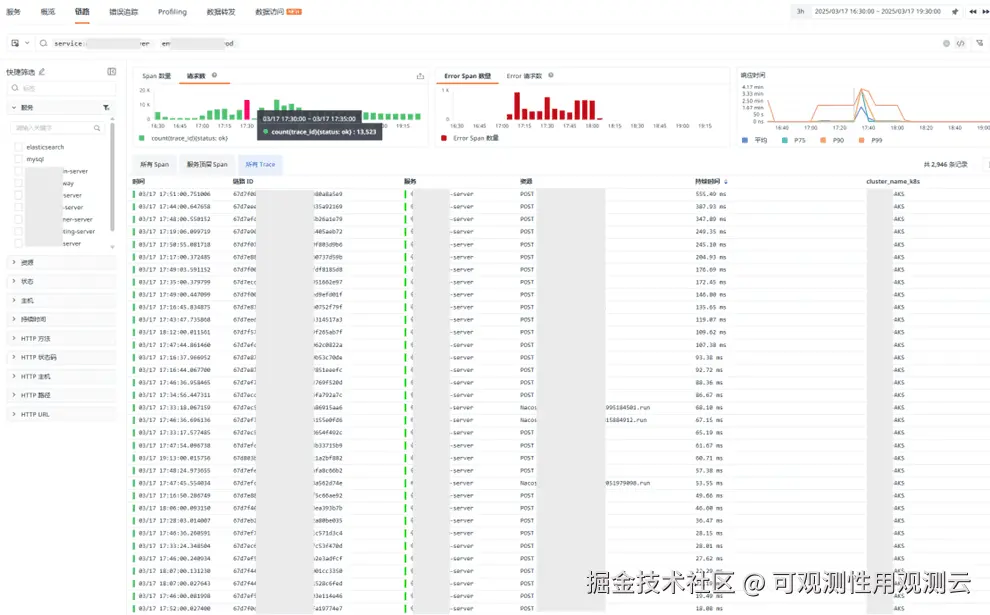 - 如图,通过观测云查看到,请求量增加,从 1 万 3 的请求量级增加到,20 万左右量级,并出现大量报错,请求超时,建议平时做好压测