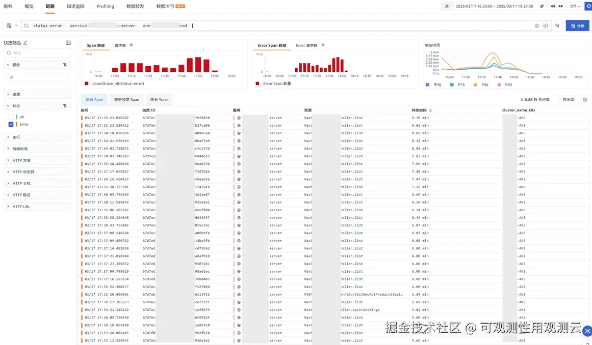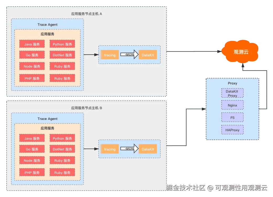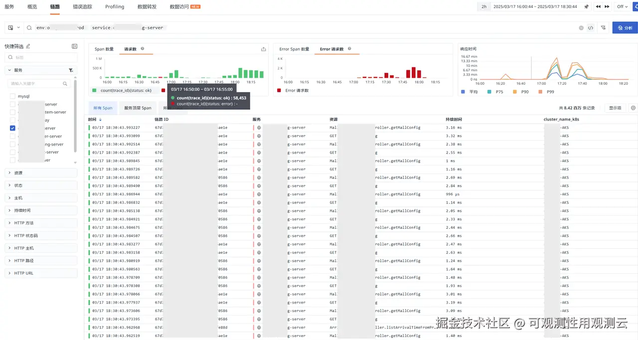 观测云拥有应用性能监测的能力,支持各种主流语言的技术栈,并兼容 OpenTelemetry,Skywalking,Jaeger,DDTrace 等等开源的 Agent,最佳部署方案是将 DataKit 部署在每一台应用服务器中,通过服务所在主机的 DataKit 后将数据打到观测云中心,能更好地对应用服务的服务器主机指标、应用日志、系统日志、应用服务链路数据等统一汇聚,进行各项数据的关联分析,而观测云应用性能监测主要功能包含服务,概览,链路,错误追踪,Profiling,应用性能指标检测等功能,本文主要基于观测云的应用监测能力,对用户故障场景进行分析实践。
