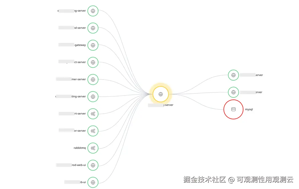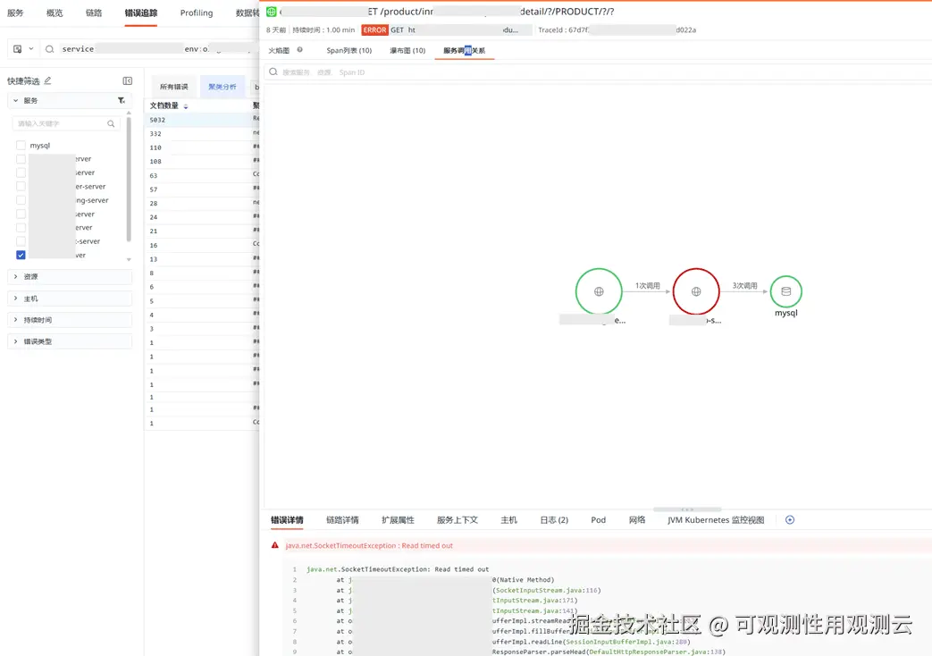 - 查看链路调用超时的拓扑图,有调 MySQL 数据库,在应用侧超时报错