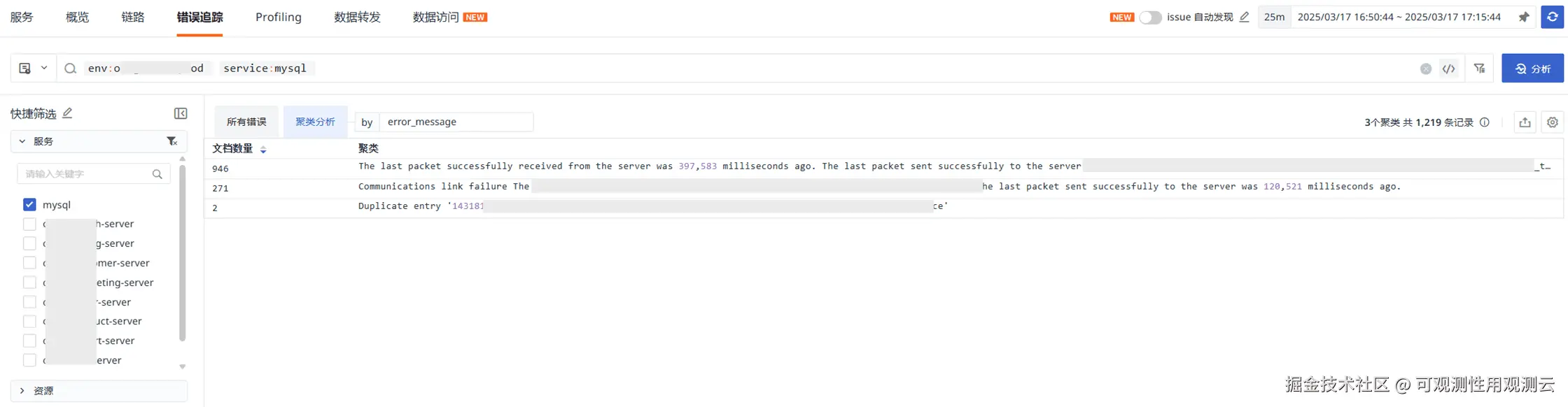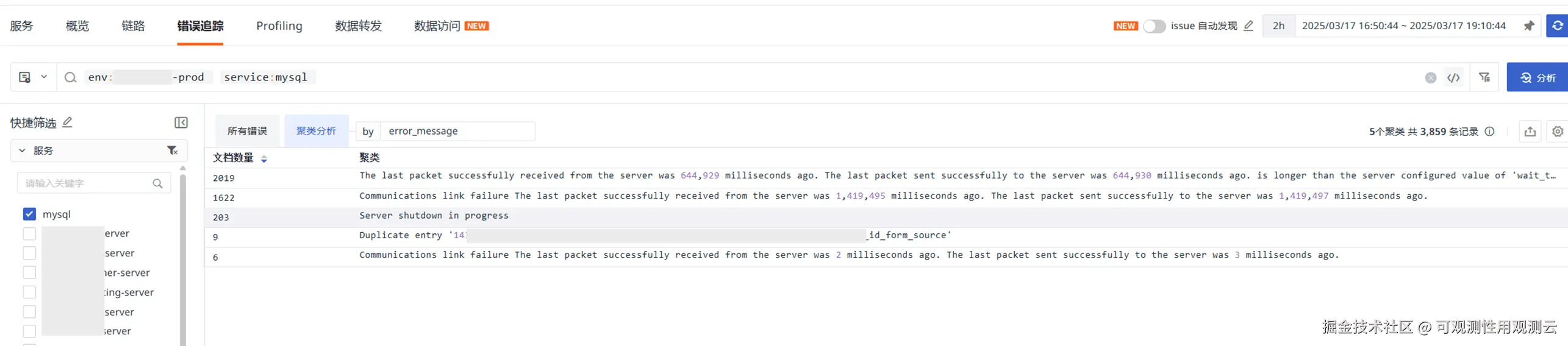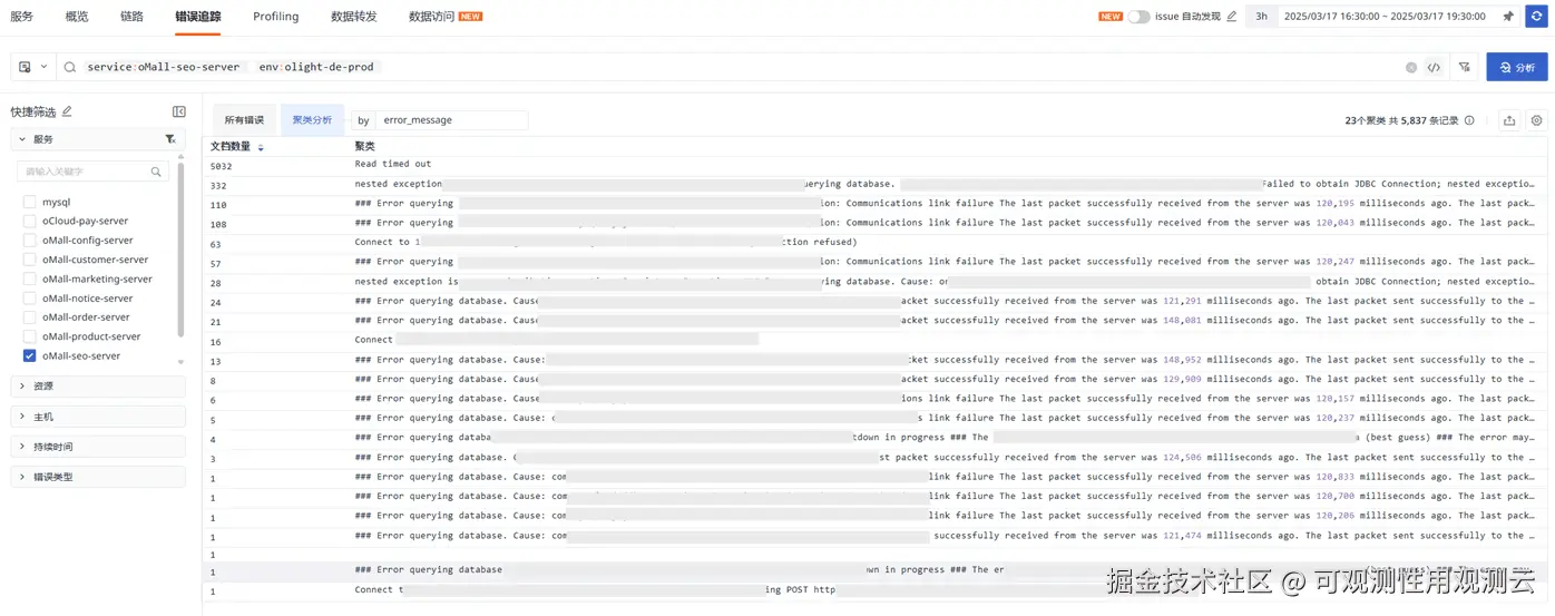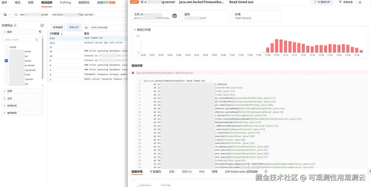 - 查看报错聚类分析,服务报错在该段时间,Read time out 报错最多