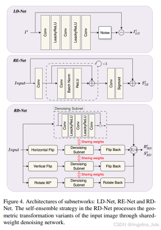 图4:子网络架构:LD-Net、RE-Net和RD-Net。RD-Net中的自集成(SE)策略通过共享权重的去噪网络处理输入图像的几何变换变体。