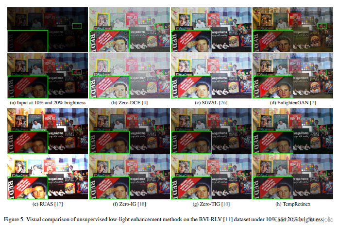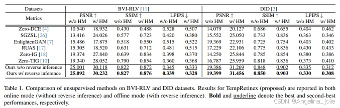 表1:在BVI-RLV和DID数据集上无监督方法的对比。TempRetinex的结果报告了在线模式(无反向推理)和离线模式(有反向推理)。加粗和下划线分别表示最佳和次佳性能。
