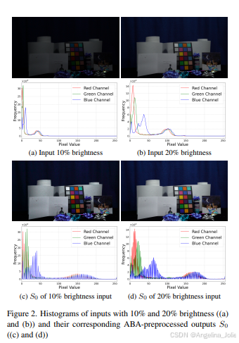 图2:10%和20%亮度输入的直方图((a)和(b))及其对应的ABA预处理输出S0的直方图((c)和(d))。可以看到,经过ABA预处理后,不同亮度输入的分布变得非常相似。