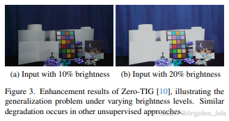 图3:Zero-TIG方法在不同亮度级别下的增强结果,说明了泛化问题。输入非常暗时输出欠曝,输入比训练数据均值亮时输出过曝。其他无监督方法也存在类似退化。