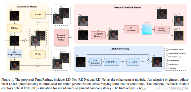 图1:提出的TempRetinex框架整体架构。主要包括增强模块(LD-Net, RE-Net, RD-Net)和时间反馈模块。引入了自适应亮度调整(ABA)预处理以适应不同光照条件。时间反馈模块利用光流(OF)估计进行帧间对齐和一致性保持。最终输出是 R_RD^t。