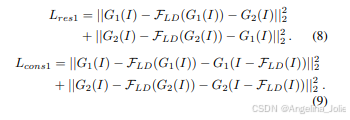 公式8:LD-Net的残差损失(L_res1)和一致性损失(L_cons1),通过下采样构造训练对进行无监督去噪学习。