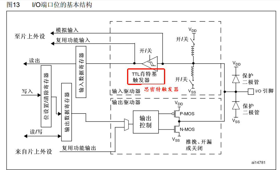 •输入模式下可读取端口的高低电平或电压,用于读取按键输入、外接模块电平信号输入、ADC电压采集、模拟通信协议接收数据等