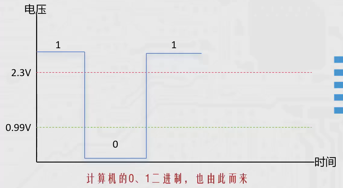 -低电平,逻辑表示为0。通常认为小于供电电压(3.3V)的30%,即0.99V即,通过电压的高低(大于某个阈值、小于某个值)来决定0、1