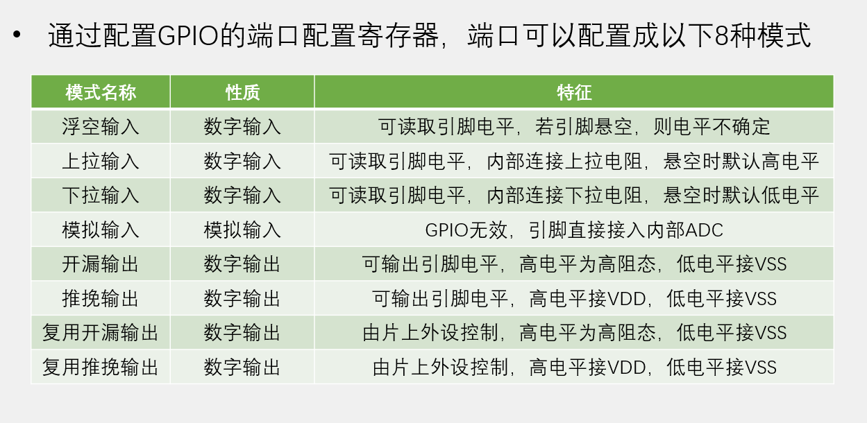 •输出模式下可控制端口输出高低电平,用以驱动LED、控制蜂鸣器、模拟通信协议输出时序等
