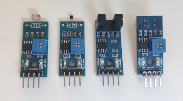 •传感器模块:传感器元件(光敏电阻/热敏电阻/红外接收管等)的电阻会随外界模拟量的变化而变化,通过与定值电阻分压即可得到模拟电压输出,再通过电压比较器进行二值化即可得到数字电压输出