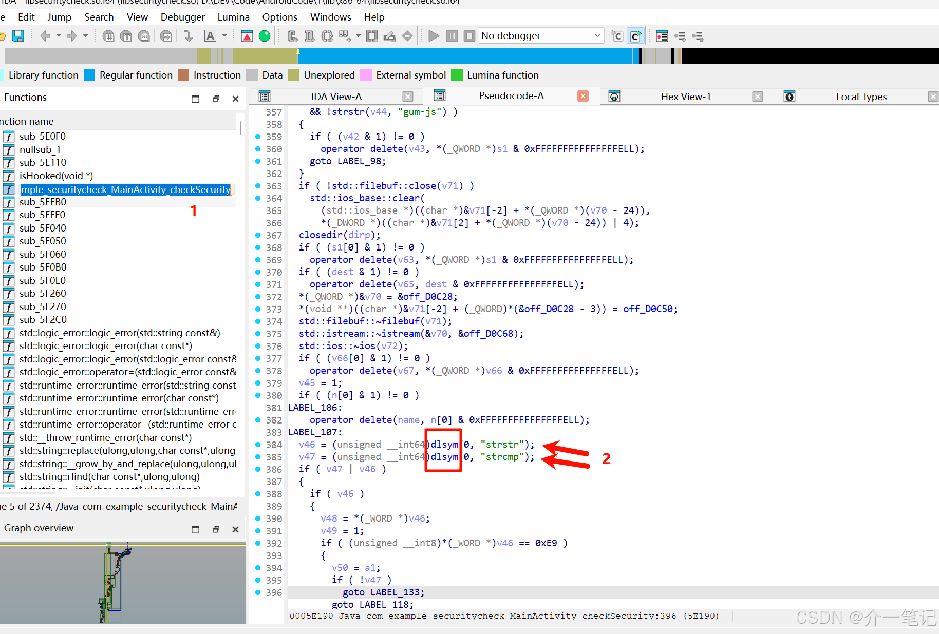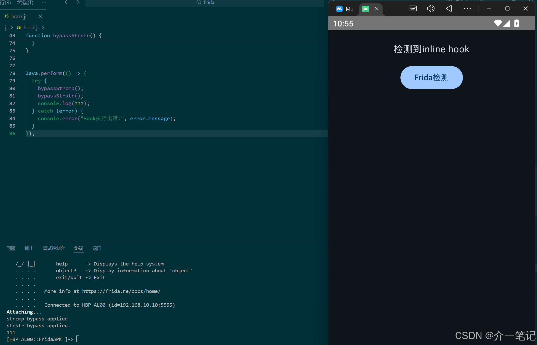 isHooked函数 :根据架构(ARM64/x86_64)检查函数开头的机器码是否包含Frida特征的跳转指令(如ARM64的0x14000000、0x94000000等跳转指令掩码,x86_64的0xE9(jmp)、0xFF(间接跳转)等);checkInlineHooks函数 :通过dlsym获取strstr和strcmp(高频被Hook的系统函数)的地址,调用isHooked检查这两个函数是否被篡改;checkFrida函数 :保留上一章的线程名检测逻辑,通过扫描/proc/[pid]/task/[tid]/status中的Name字段识别Frida相关线程;Java_com_example_securitycheck_MainActivity_checkSecurity函数 :综合checkFrida(线程名检测)和checkInlineHooks(inline hook检测)的结果,返回最终检测结论。