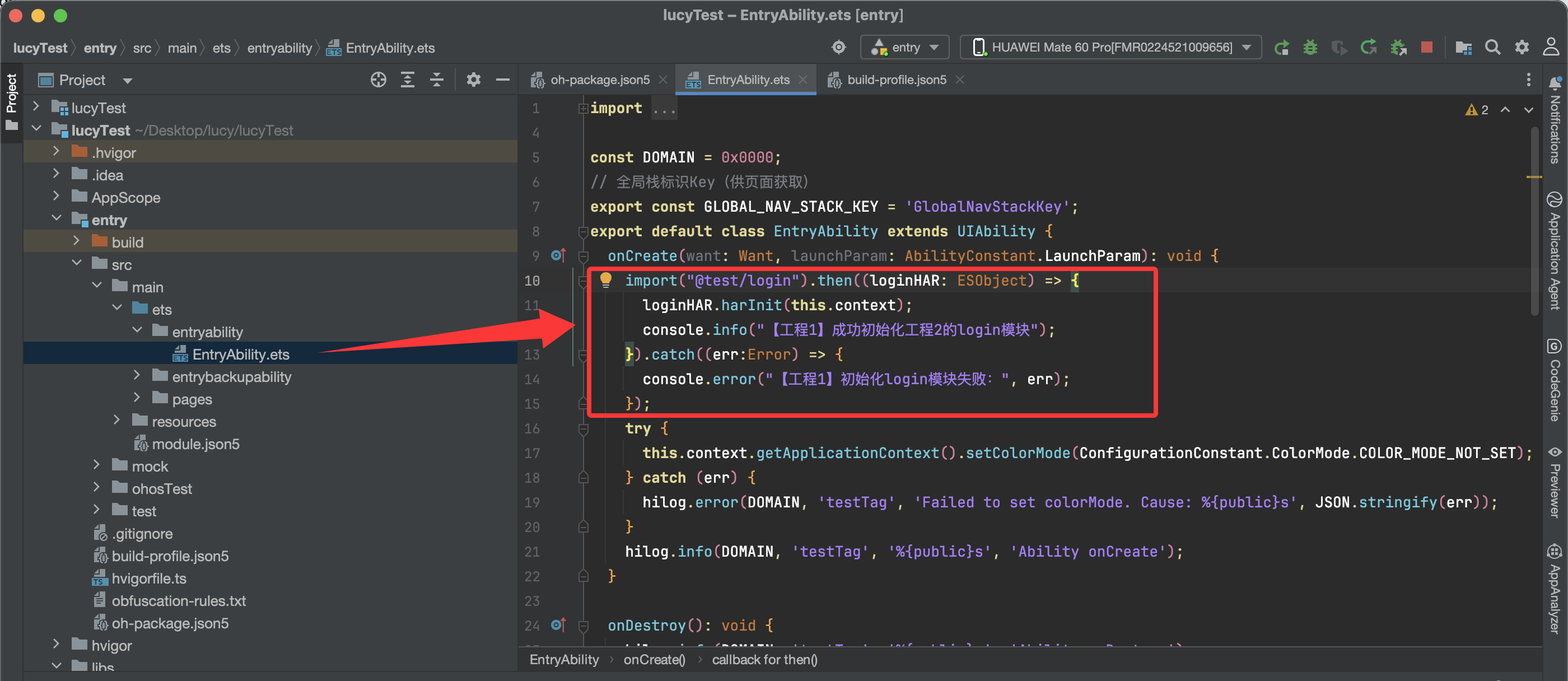 在lucyTest的EntryAbility.ets中,动态导入login模块并执行初始化(传递主工程上下文):
