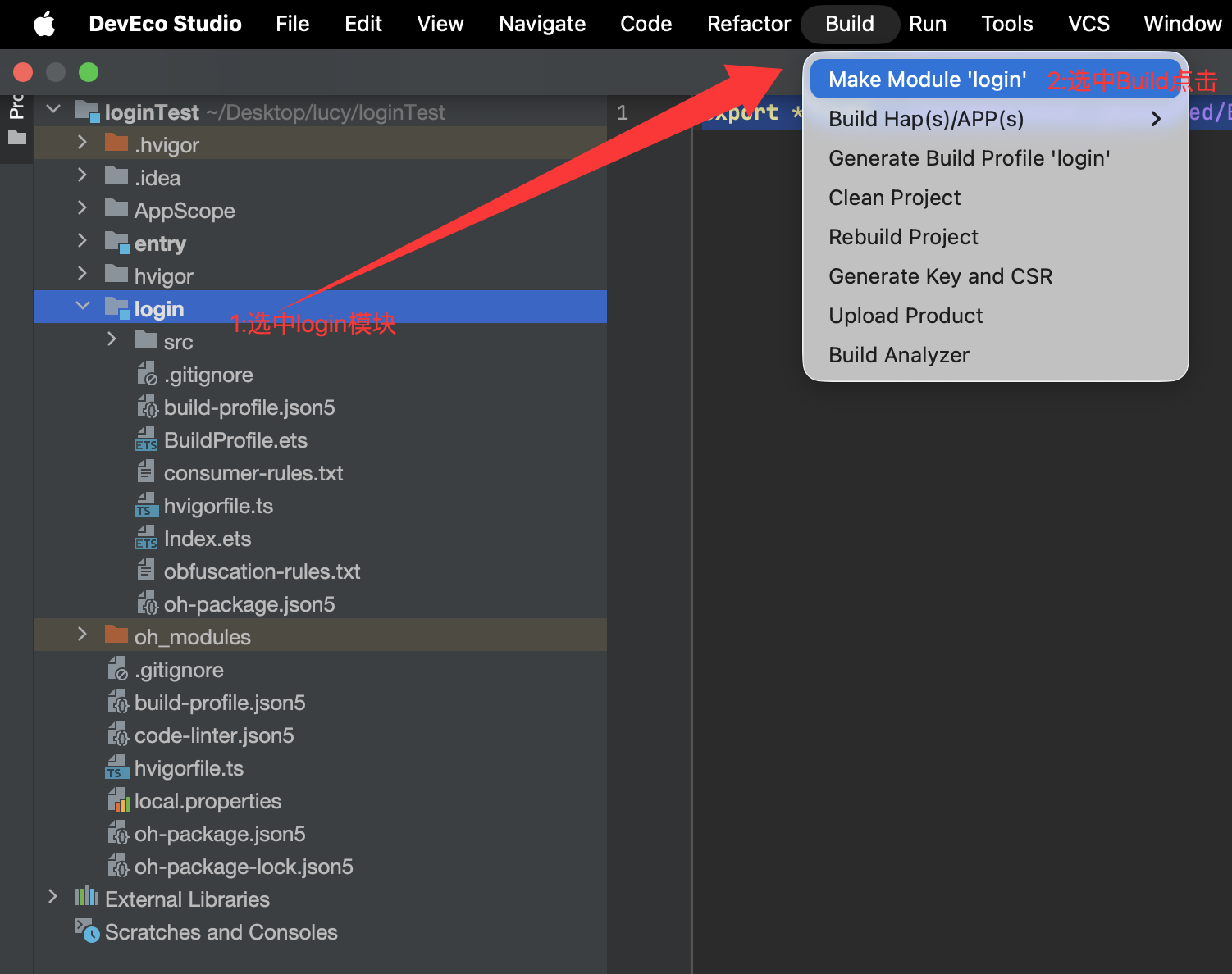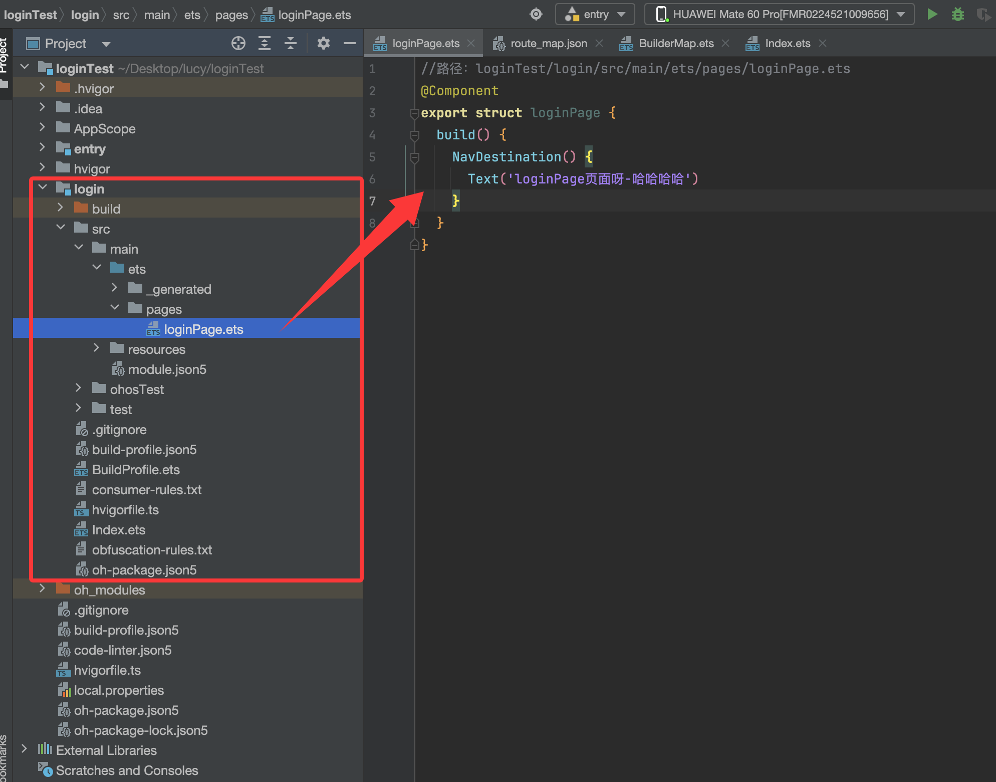 在loginTest工程内新建login模块可被其他工程依赖,并提供可跳转的页面(loginPage.ets)