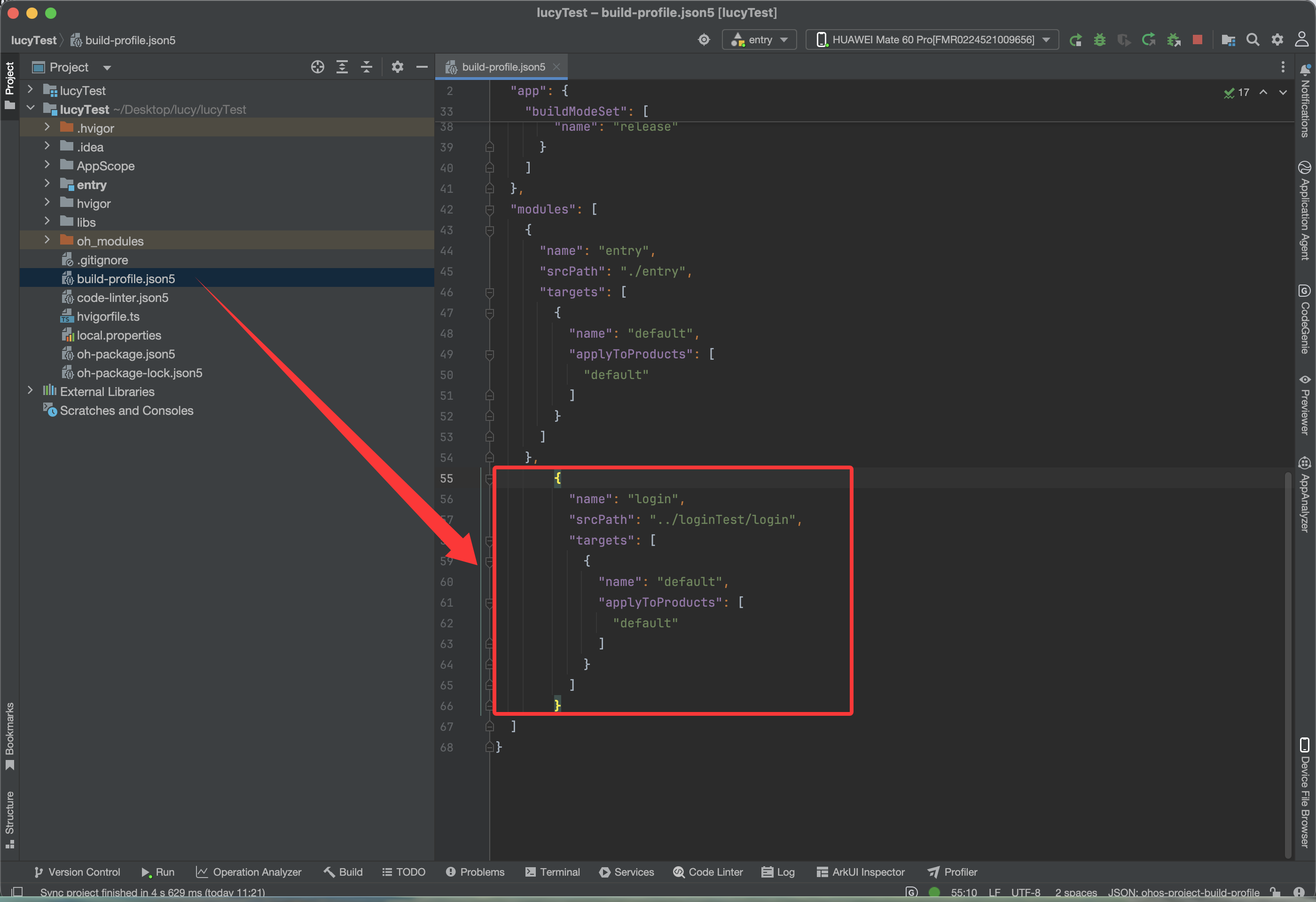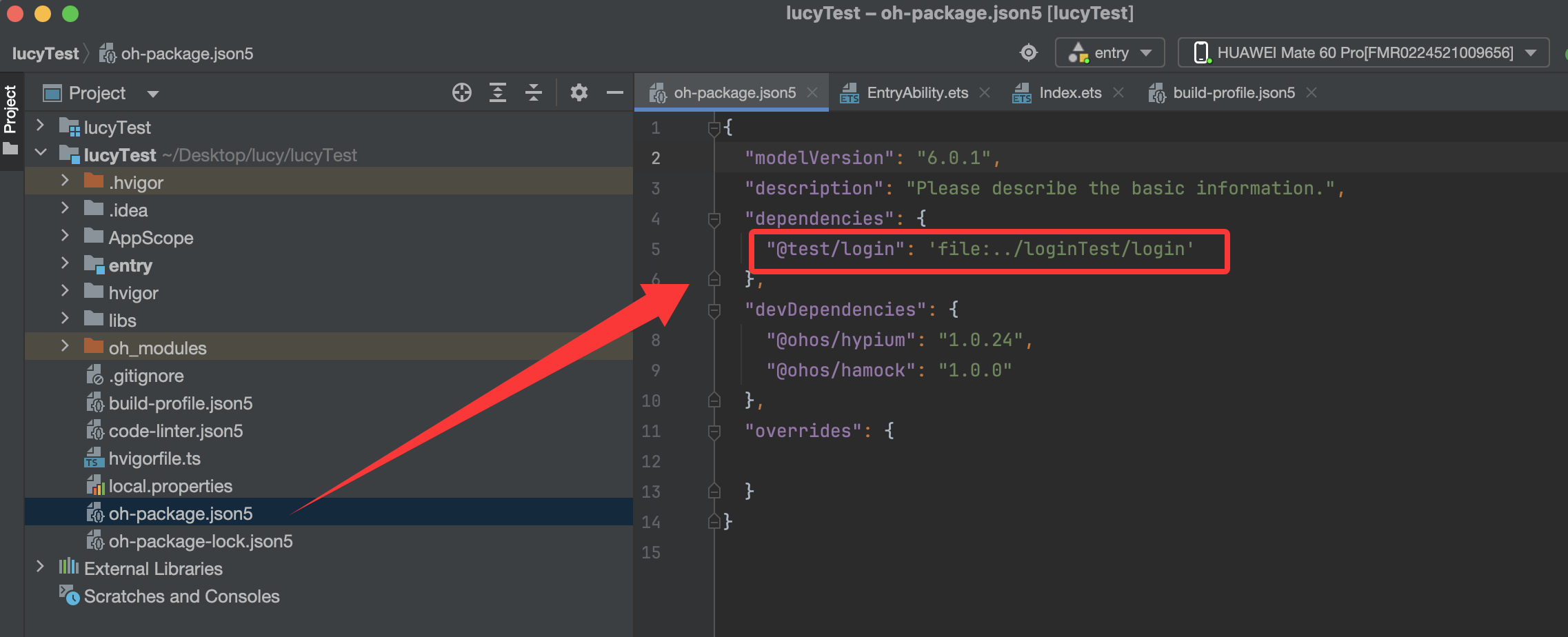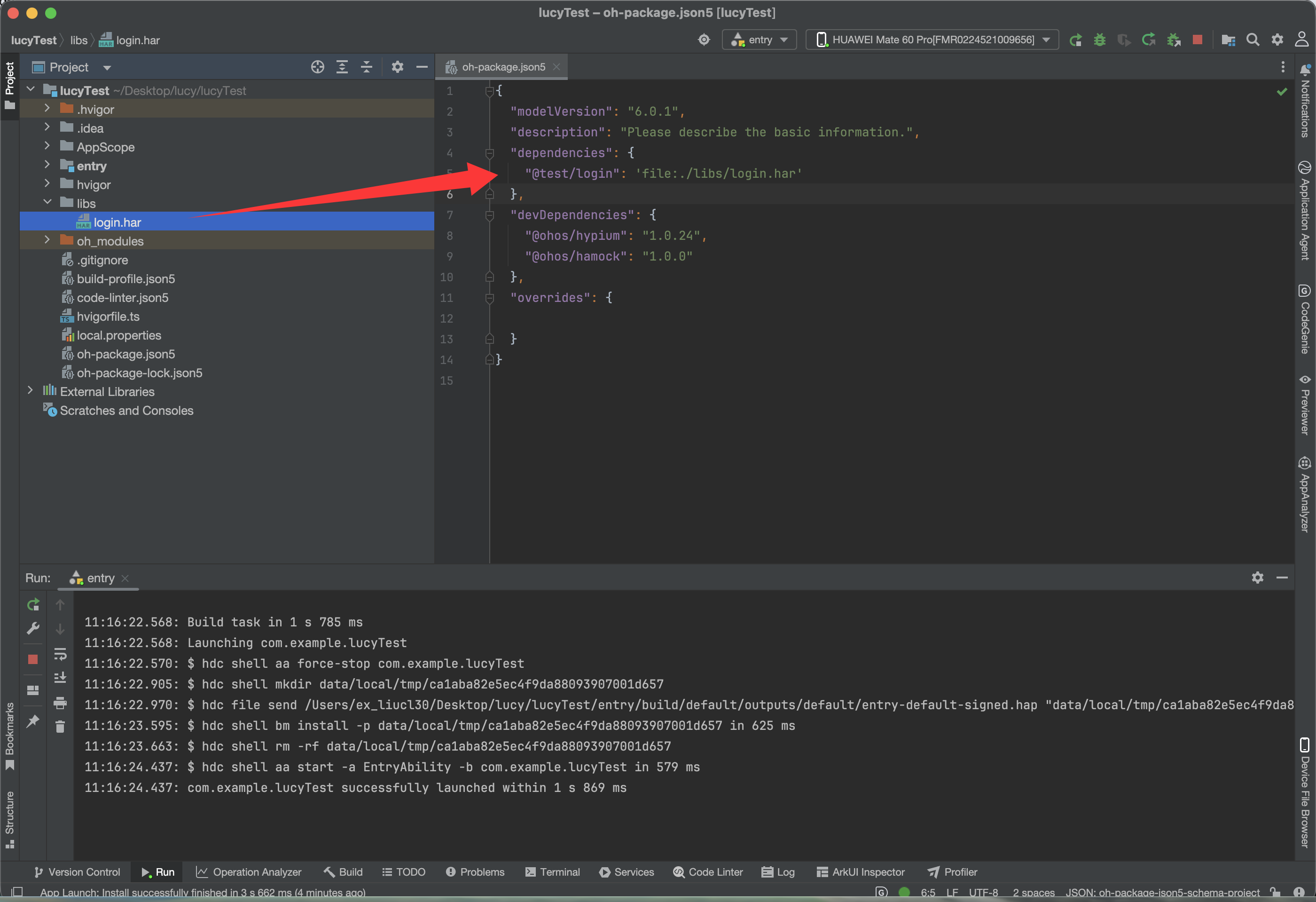 将login模块的 HAR 包放入lucyTest的libs目录,再在oh-package.json5中依赖:
