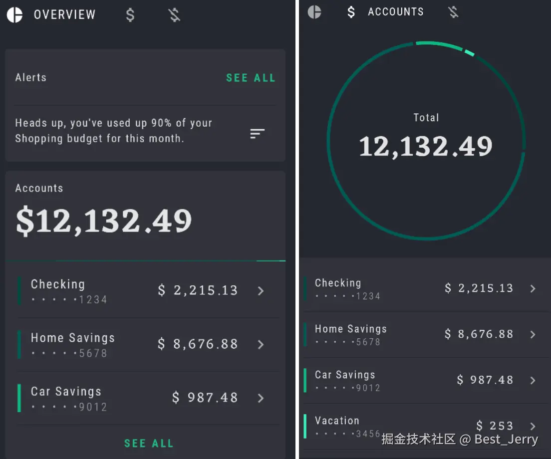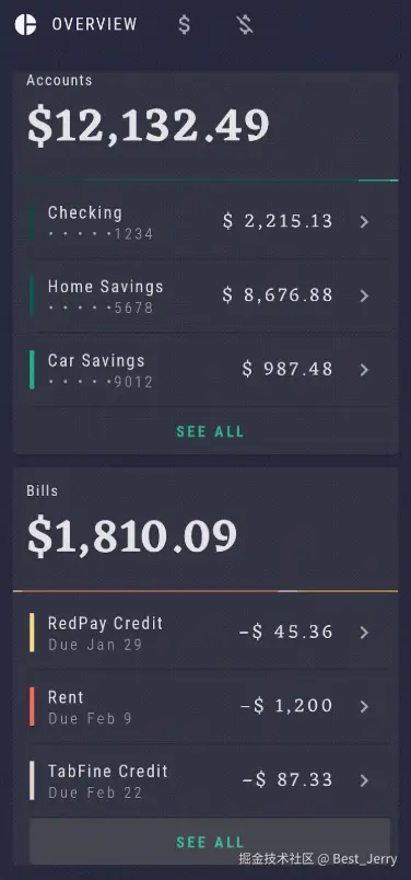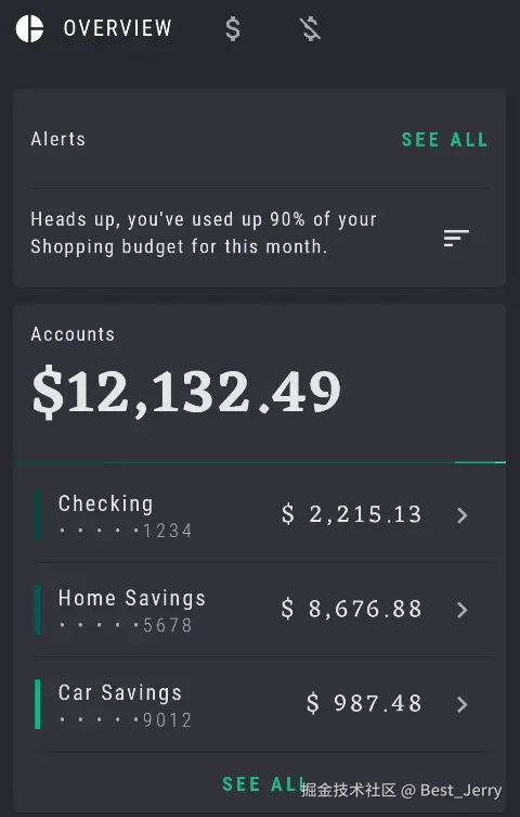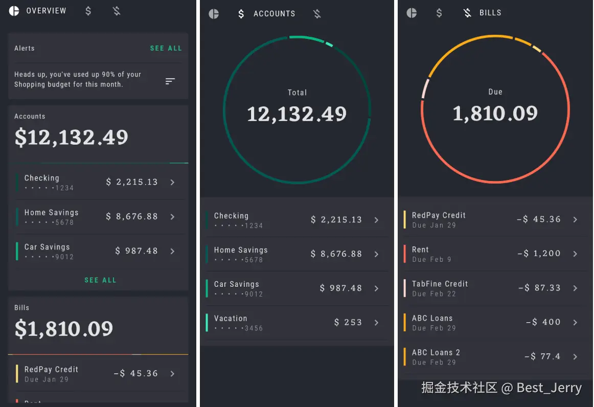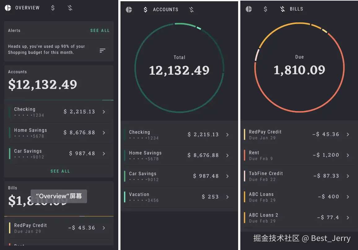 OverviewScreen- 所有财务交易和提醒的概览AccountsScreen- 有关现有账户的数据分析BillsScreen- 预定支出