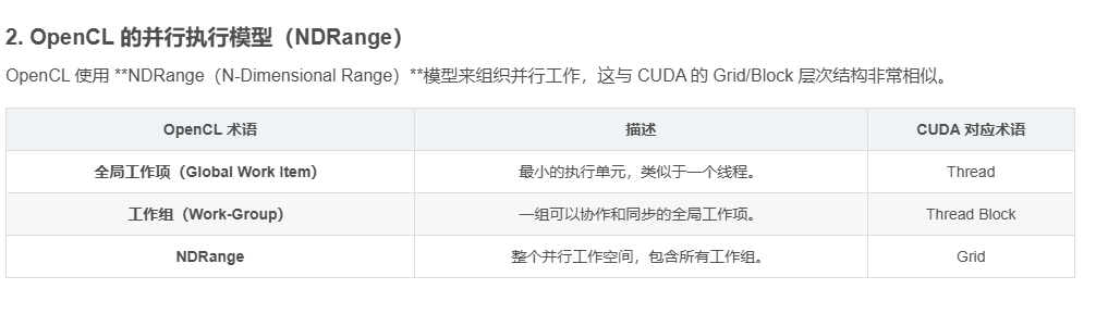 执行模型: OpenCL 定义了与 CUDA 相似的线程执行模型。